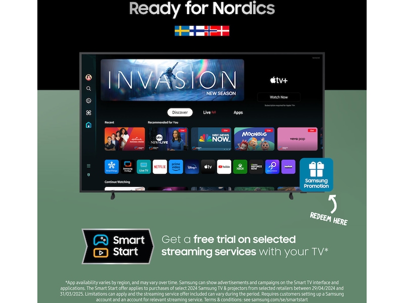 *Gjelder ved kjøp av utvalgte Samsung TV-er fra 2024 og utvalgte projektormodeller på samsung.com og hos utvalgte forhandlere i perioden 29.04.2024–31.03.2025. Underlagt begrensninger, og strømmetjenestetilbudene som inngår, kan variere i løpet av kampanjen. Krever Samsung-konto og at kunden oppretter konto hos den aktuelle strømmetjenesten. Vilkår: samsung.com/no/smartstart