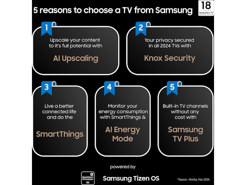 *Gjelder ved kjøp av utvalgte 2024 Samsung TV hos utvalgte forhandlere. Garantien gjelder i 10 år fra kjøpsdato. Krever en kopi av kvittering samt registrering på Samsungs nettsted innen 90 dager etter kjøp. Gjelder ved kjøp av utvalgte TV-modeller for 2024 til og med 31. mars 2025.