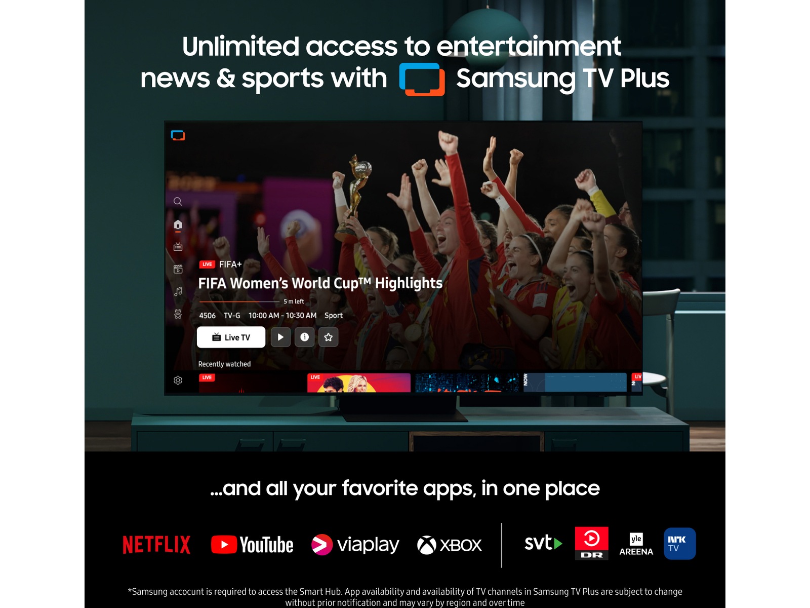 Med en Smart-TV fra Samsung er en mengde underholdning bare et knappetrykk unna. I en kostnadsfri prøveperiode kan du streame spill, filmer og serier fra utvalgte streamingtjenester*. For å benytte deg av aktuelle tilbud må du installere og åpne «Samsung Promotion»-appen på TV-en.