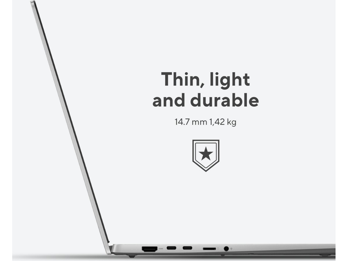 - Ultraportabel, tynn og lett design med en profil på 14,7 mm og et 1,42 kg tungt førsteklasses metallkabinett for enkel transport og holdbarhet i militærklassen.