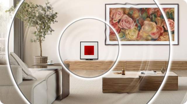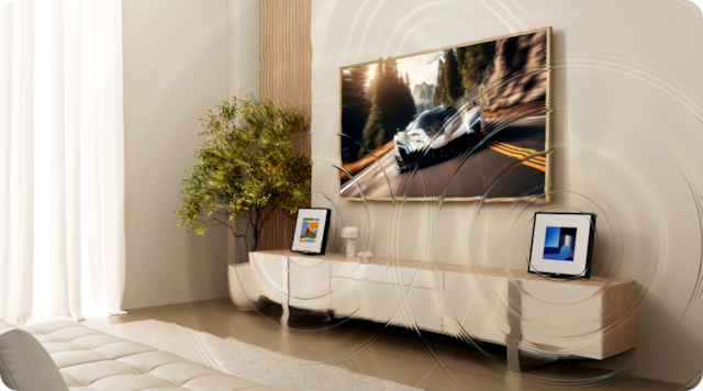 TV og Music Frame i harmonisk samspill. TV-høyttalerne spiller sammen med Music Frame for en større lydopplevelse.*
