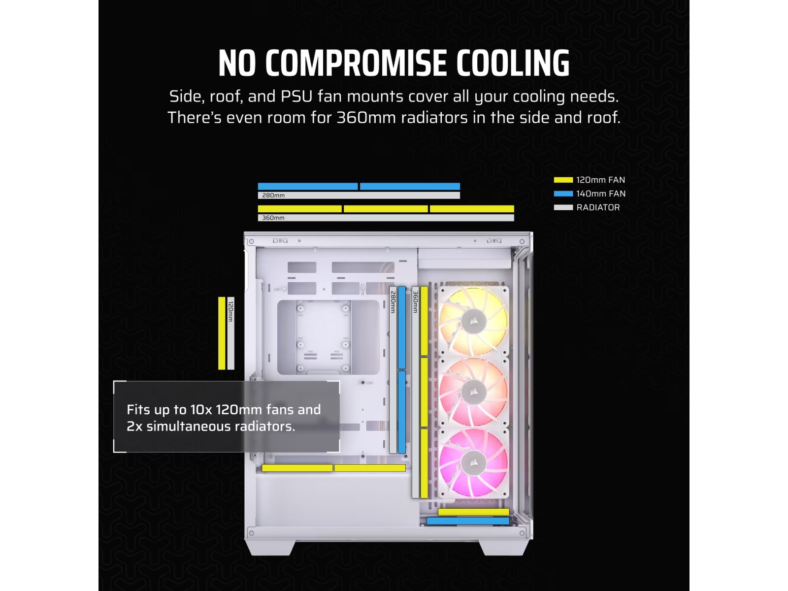 Tilpass ditt kjølesystem med plass til opptil 10x 120 mm vifter, pluss allsidige radiatorfestealternativer inkludert opptil 360 mm på siden og taket.
