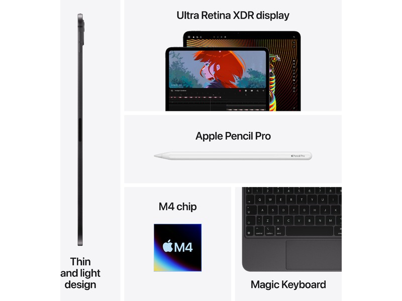 Nye iPad Pro er ufattelig tynn og utstyrt med kolossal ytelse fra Apple M4-chipen, en grensesprengende Ultra Retina XDR-skjerm og lynrask wifi 6E.1 Sammen med Apple Pencil Pro og Magic Keyboard får du uendelig allsidighet, kreativitet og produktivitet for hånden.