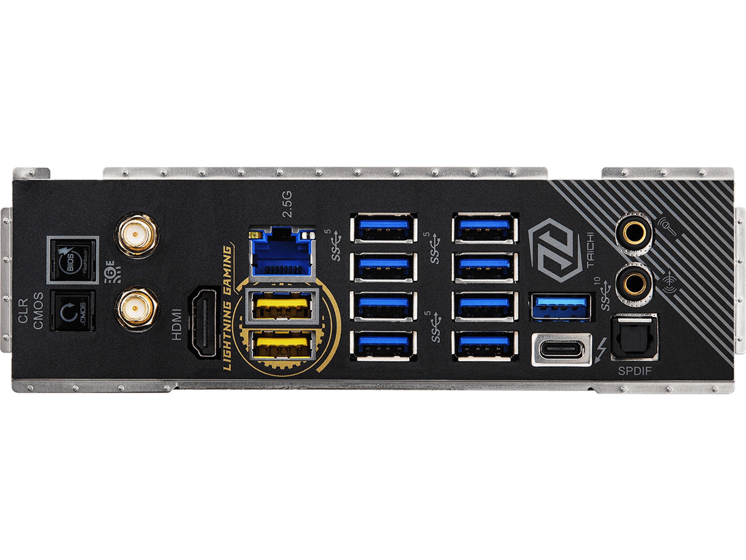 1 x HDMI, 8 x USB 3.2 Gen 1, 2 x antenne, 1 x lydutlinje - minijakk, 1 x LAN (2.5Gigabit Ethernet), 3 x USB 3.2 Gen 2, 1 x SPDIF-utgang, 1 x USB4, 1 x mikrofon - minijakk