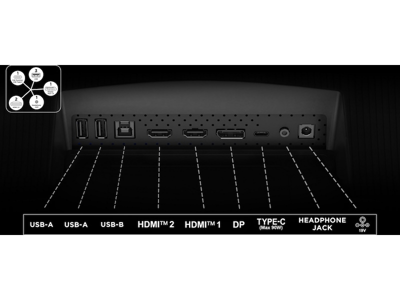 Kontor modus, USB-C-strømlevering inntil 90 W, FPS Mode, RPG Mode, Antirefleks, Pantone Validated, Movie Mode, Eye Saver Mode, 1152 lokale dimmesoner, Low Blue Light-teknologi, Ebokmodus, KVM, Variabel oppdateringsfrekvens (VRR)