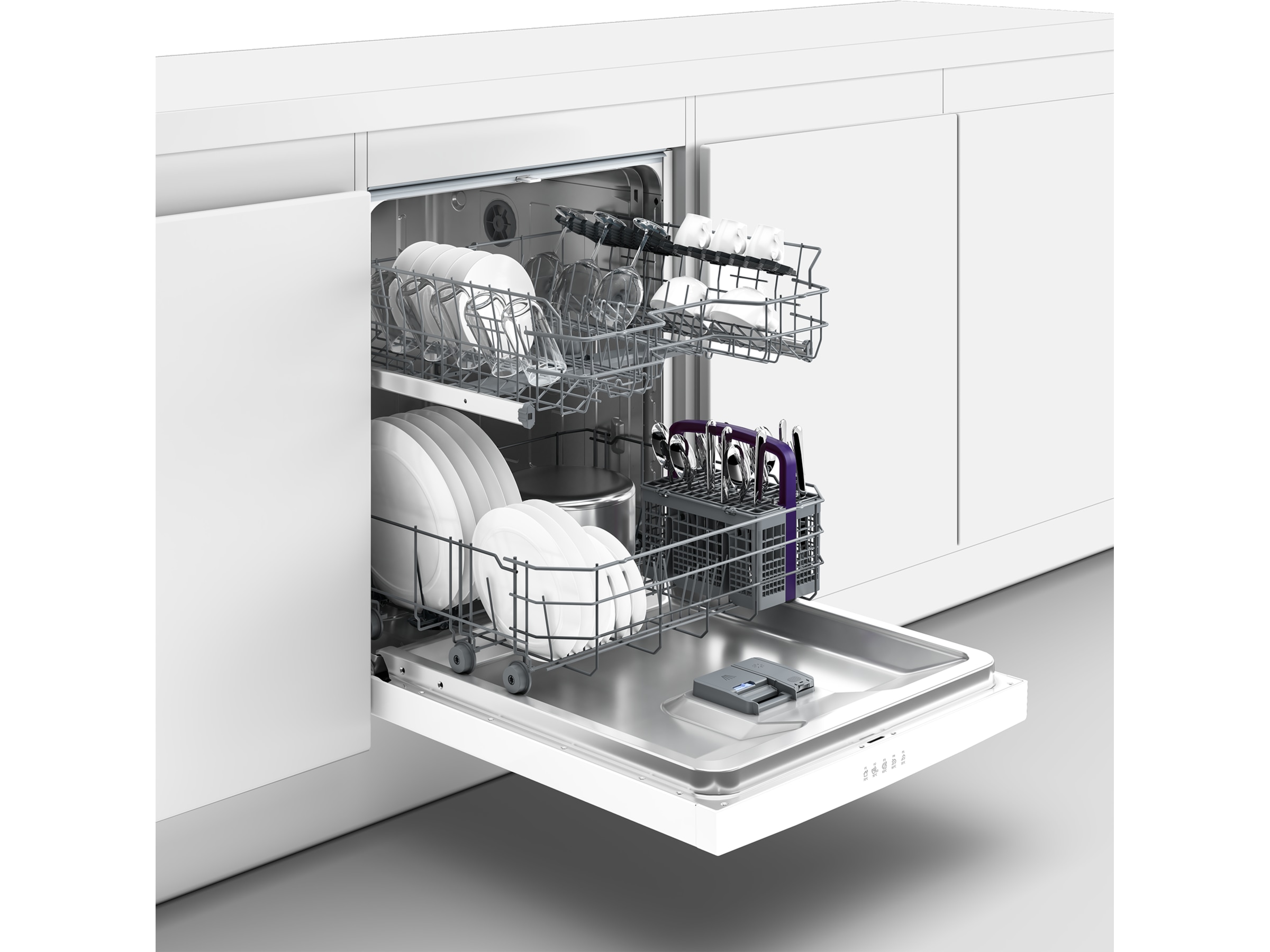 Bestikkurven er en smart oppfinnelse, men den kan være i veien når du ønsker å plassere en stor gryte nederst i oppvaskmaskinen. Den flyttbare bestikkurven løser det problemet, den kan flyttes fritt til høyre og venstre, slik at du får plass til de største gjenstandene.