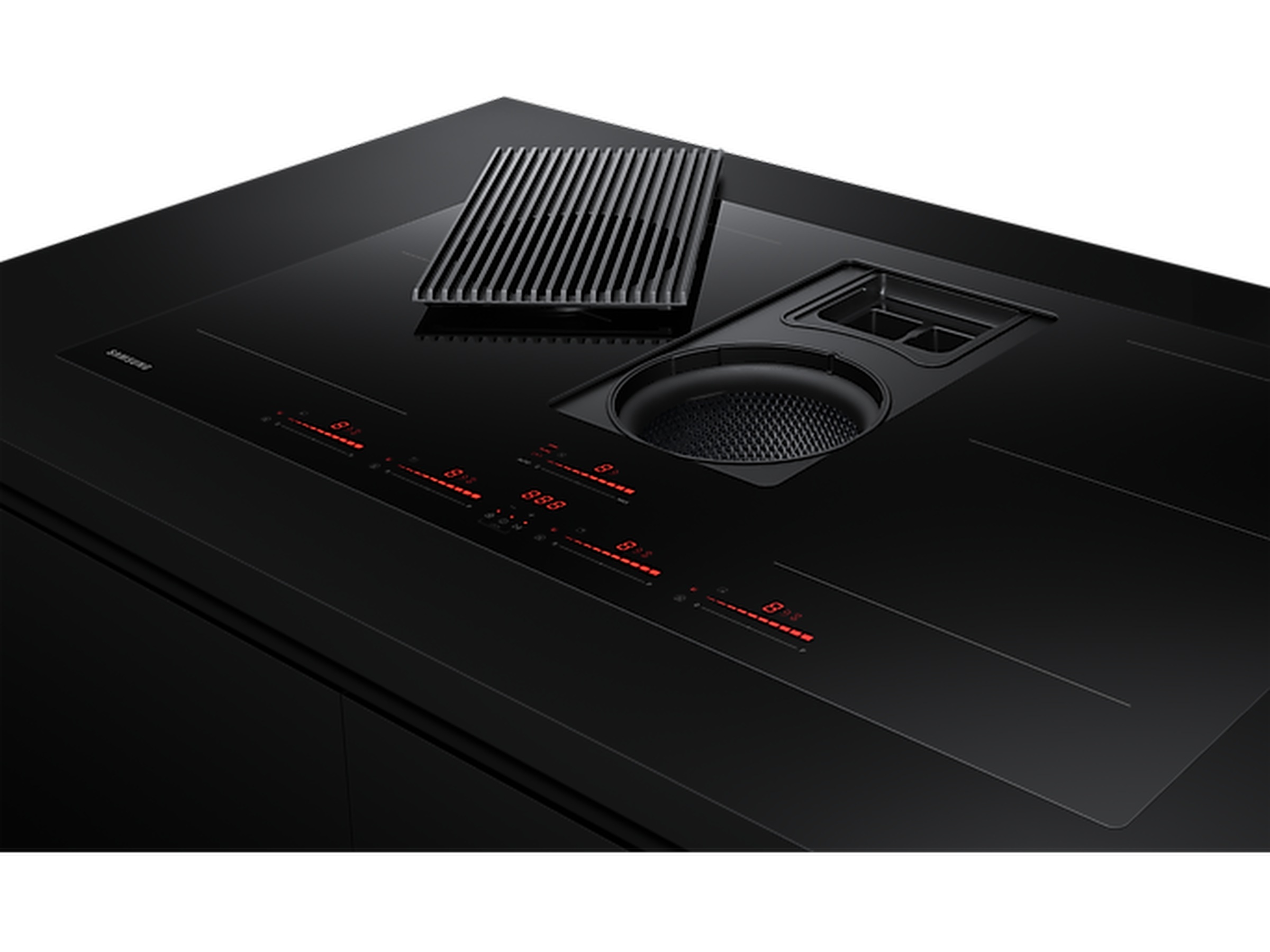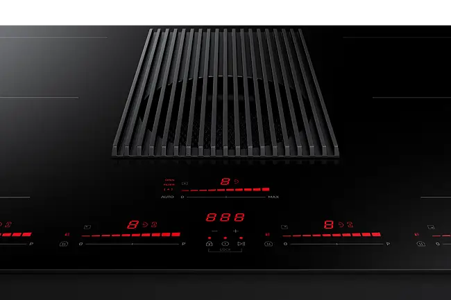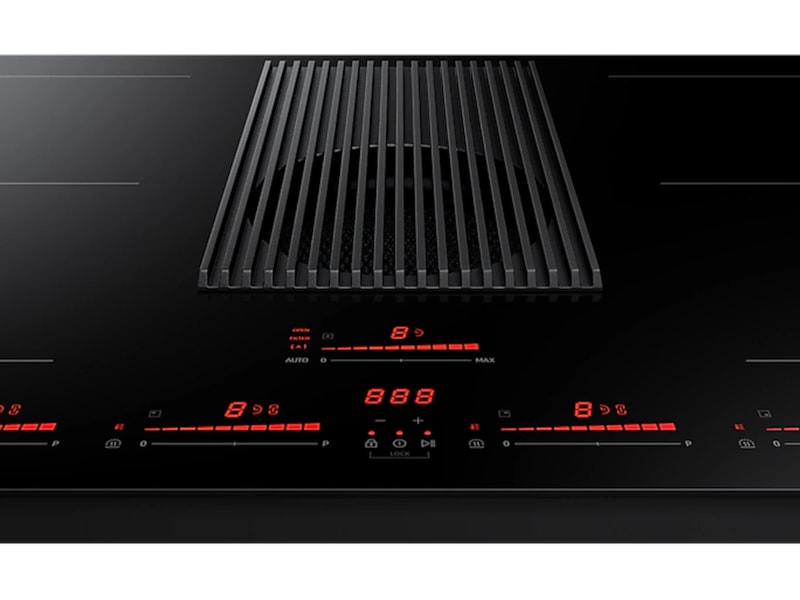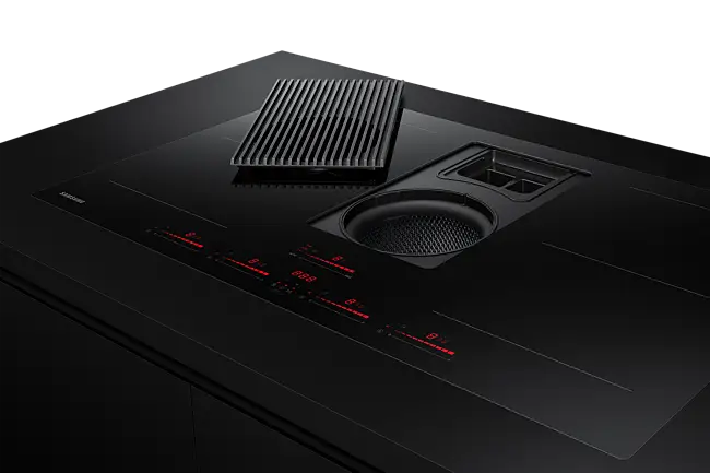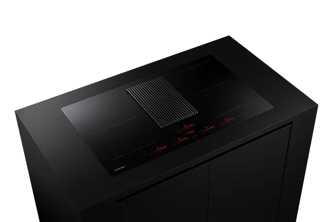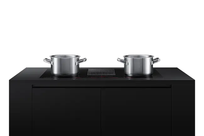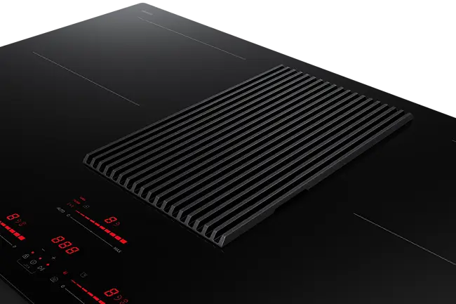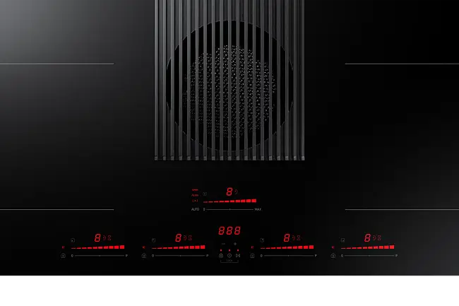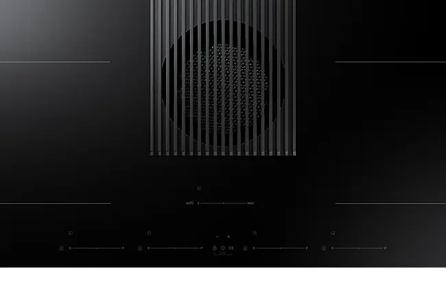 Monter platetoppen hvor du vil, uten at matosen sprer seg. Den integrerte komfyrviften midt på platetoppen fanger opp lukt og matos umiddelbart, med en effektiv ventilasjonshastighet på 620 m²/t. Og når du ikke trenger en separat komfyrvifte, kan du montere platetoppen hvor som helst, f.eks. på en kjøkkenøy.*
