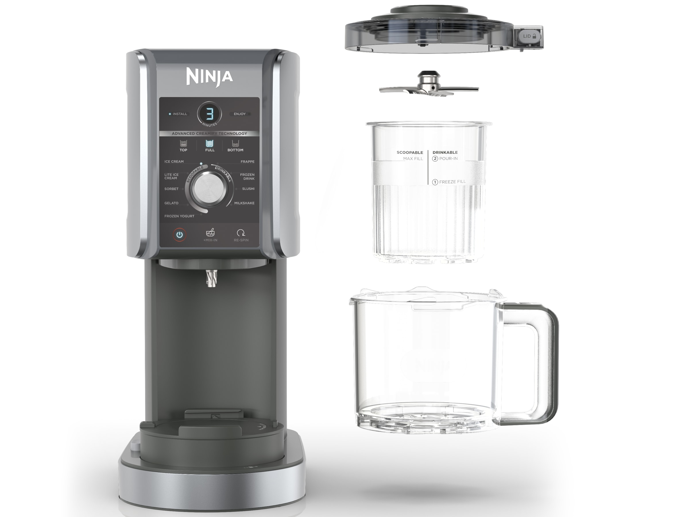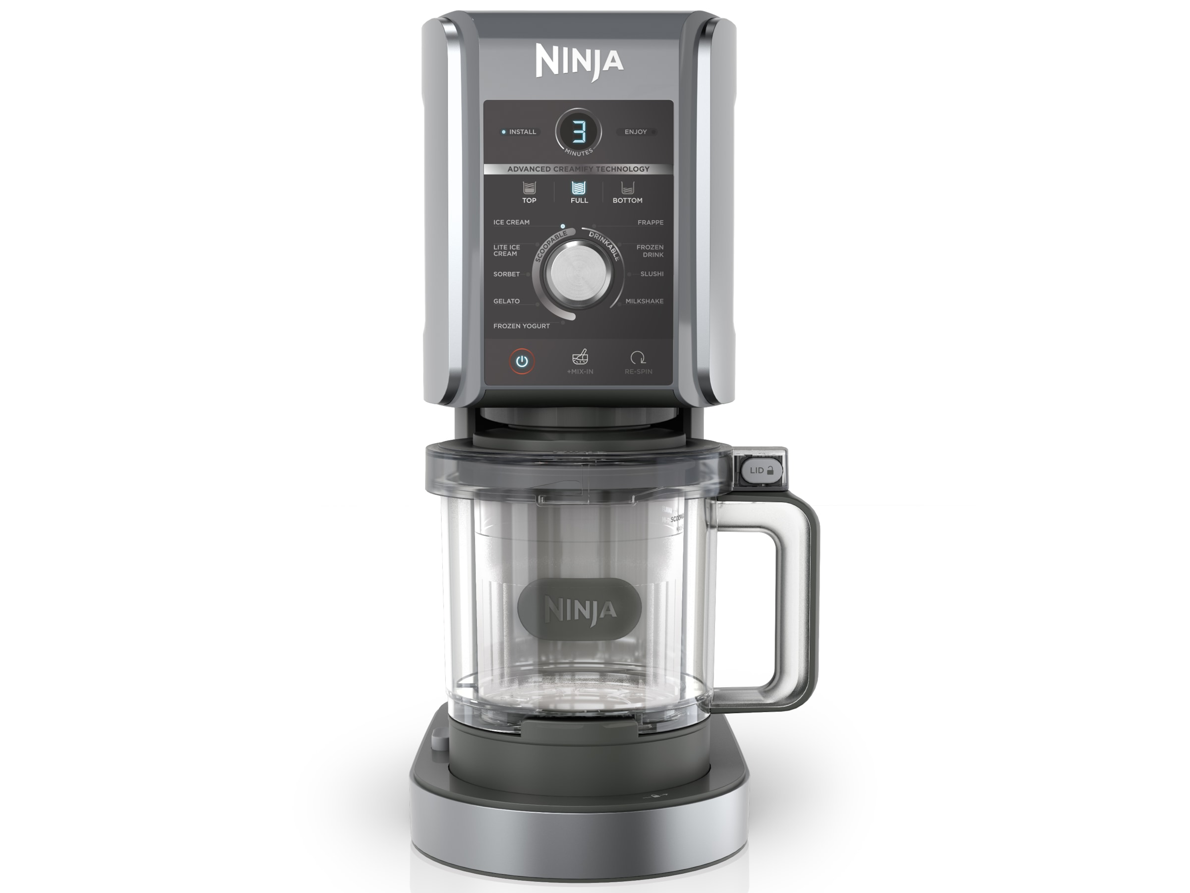 Ninja CREAMi Deluxe inneholder 10 programmer: Iskrem, Sorbet, Lett iskrem, Gelato, Milkshake, Mix-In, Frappe, Frossen Drikk, Slushi & Frozen Yoghurt. De avtakbare delene, inkludert Deluxe badekar og lokk, ytre bolle, lokk og padle, tåler oppvaskmaskin for enkel rengjøring.