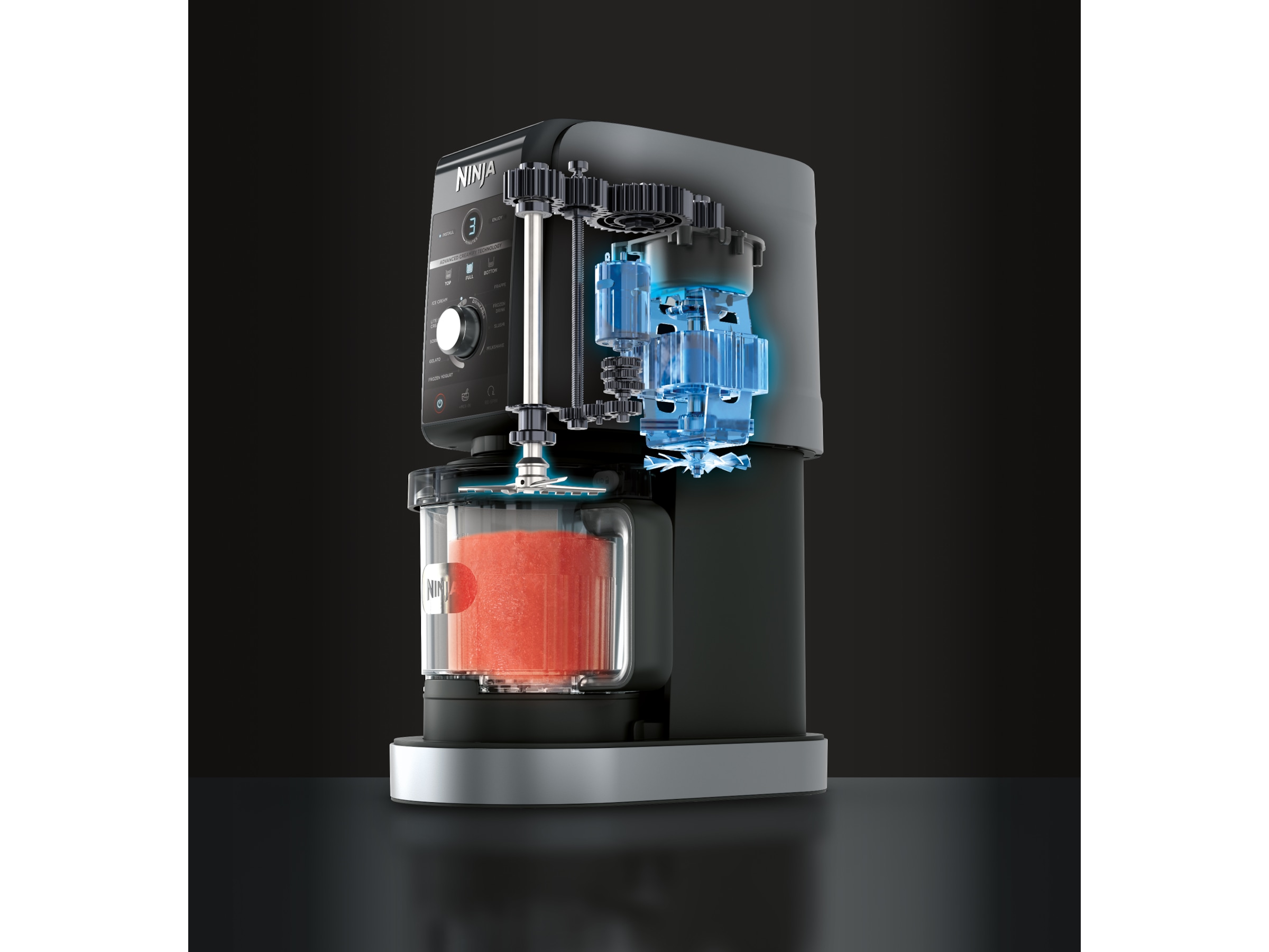 Fyll en bøtte med ingredienser og frys den i 24 timer. Du legger så bøtta i den ytre bollen, velger ønsket funksjon, behandler og nyter på noen minutter. Du kan også lage en milkshake med en gang uten å måtte fryse den.