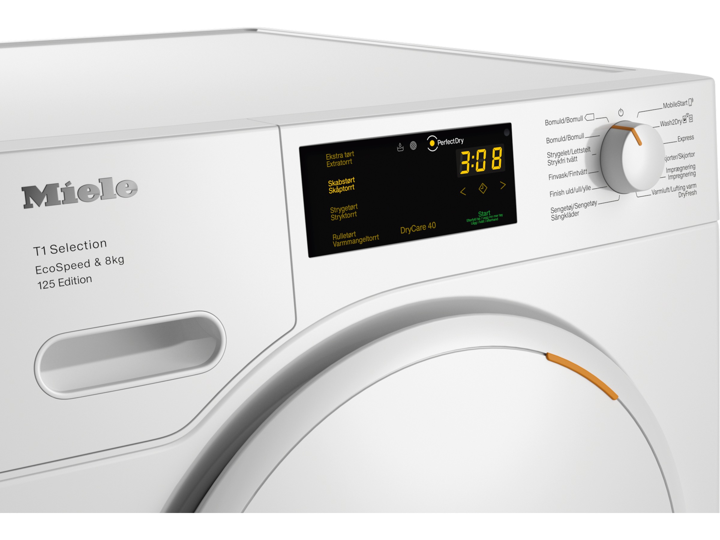 Tørkeprogrammer FragranceDos, Bomullstøy, Sengetøy, EcoSpeed, Stryketørr, Wash2Dry, PerfectDry, Delikat, Varm, Ull-finish, AddLoad, Skjorter, Rynkeforebygging, DryCare 40, Ekpress