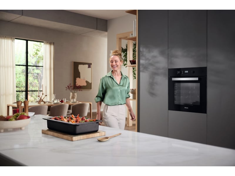 Miele stekeovner er kjølige på utsiden. Betjeningspanelet og håndtaket, samt alt interiør rundt ovnen, vil holde seg relativt kjølig. Døren består av flere glassplater. Det isolerer stekeovnsdøren på en effektiv måte og sørger for lave temperaturer på utsiden samt sikkerhet og beskyttelse mot brannskader.