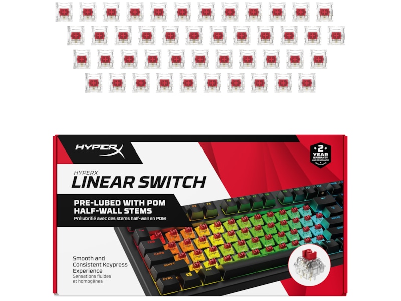 HyperX Linear Switches er tastaturbrytere som bygger videre på suksessen til våre røde brytere, men er raffinert til en mer smidig og allsidig løsning. Disse 5-pins bryterne er kompatible med de fleste 5-pins hot-swappable tastaturer, så selv om du ikke har et HyperX-tastatur, kan du fortsatt dra nytte av disse høyytelsesbryterne. HyperX Linear Switches har halvhøye stammer som øker tastestabiliteten ved raske trykk eller i krevende situasjoner. Bryterne leveres også ferdigsmurte, slik at du kan nyte jevne, stille og responsive tastetrykk rett fra esken. De er laget for å vare, med en slitesterk nylonbase som støtter fjær, blad og stamme, og et krystallklart polykarbonattoppstykke. Disse pålitelige bryterne er vurdert til en levetid på opptil 80 millioner tastetrykk.