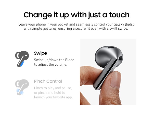 La telefonen være i lommen og styr din Galaxy Buds3 sømløst med enkle bevegelser, for å sikre en sikker passform, selv med et raskt sveip.