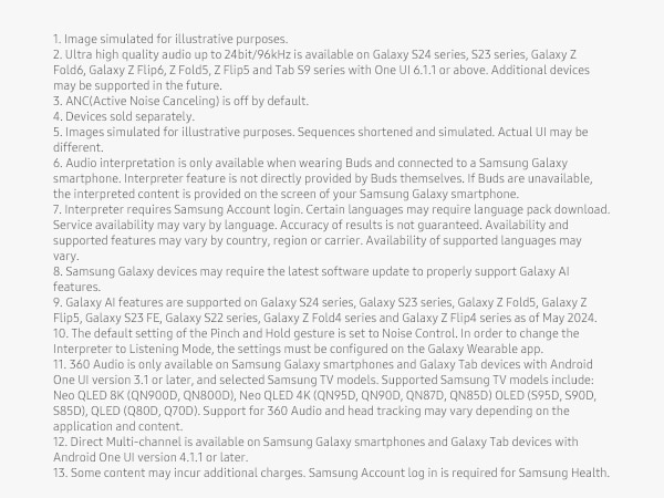Detaljer 24-bits, 96 kHz-oppløsning, Auracast, Galaxy AI, Berøringsstyring