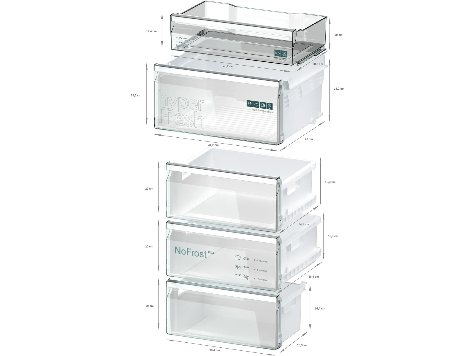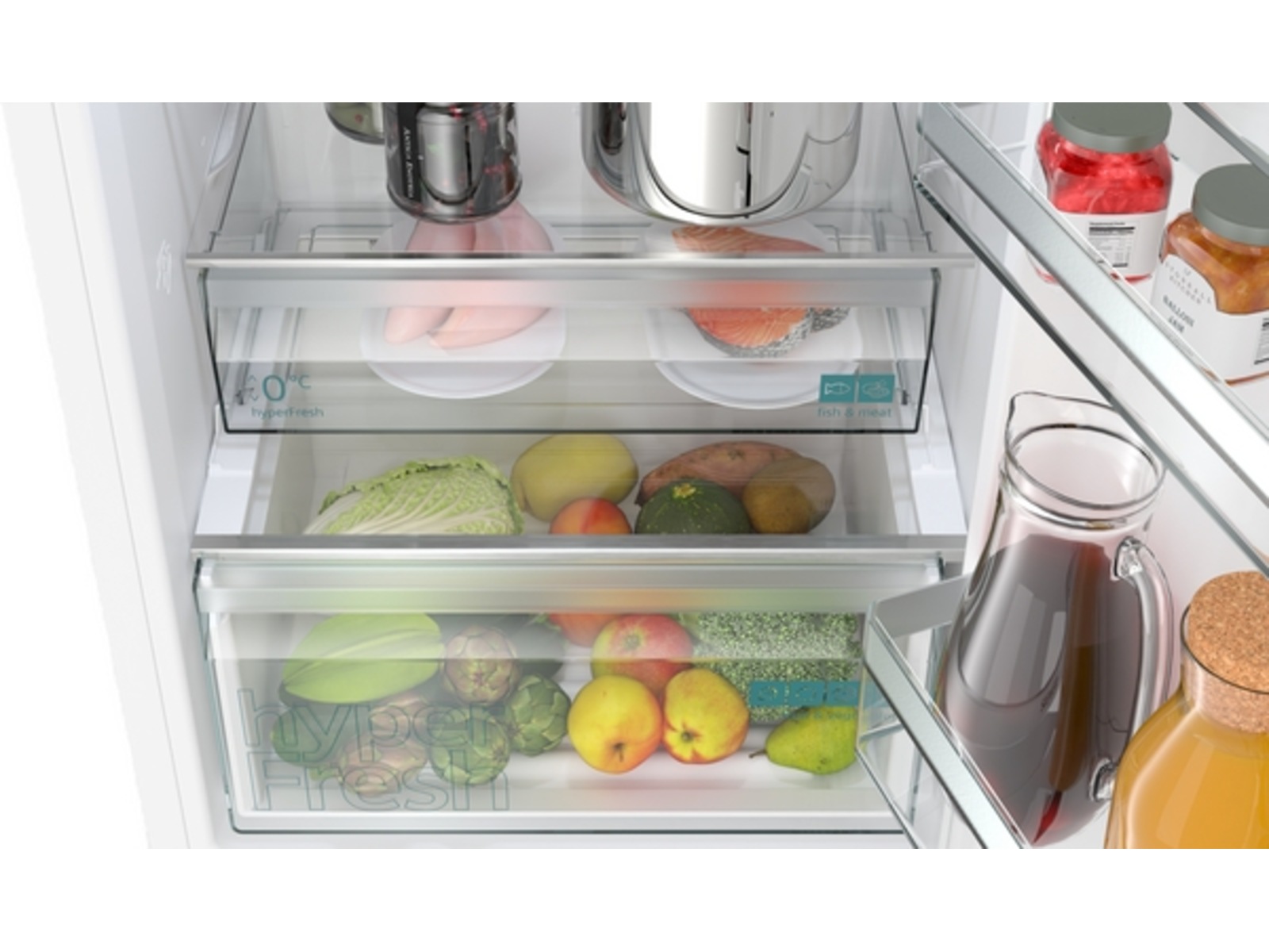Få plassen du trenger til å lagre store mengder frukt og grønnsaker. Det fins en egen oppbevaring for kjøtt og fisk også, med en egen tilførsel av kaldluft som holder maten fersk og næringsrik så lenge som mulig. Mer plass og ideell oppbevaring, i én og samme løsning.