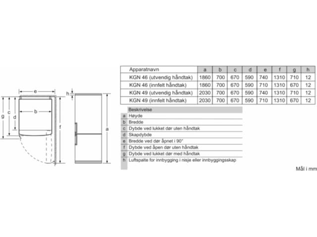 Sett kjøleskapet ditt der du aller helst vil ha det.Andre standard kombiskapmodeller på markedet trenger en avstand på rundt 10 cm fra sidevegger for at man skal kunne åpne dører og skuffer.Takket være Perfect Fit kan de frittstående kombiskapmodellene våre plasseres helt inntil vegger og andre møbler.Bredden på kombiskapet samsvarer med nisjedimensjoner.