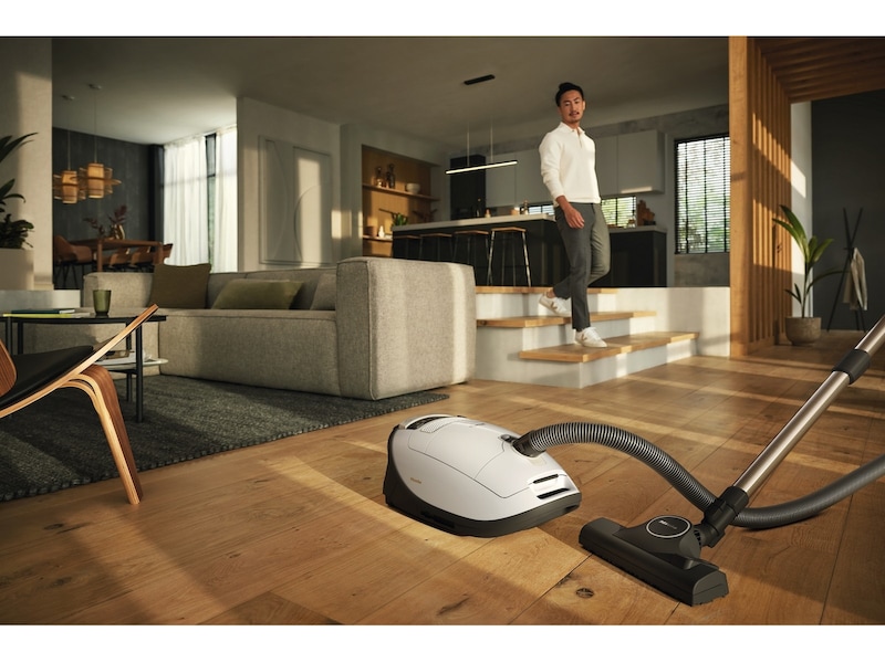 Gulvmunnstykket hektes enkelt på baksiden av støvsugeren, slik at sugerøret står trygt og tilgjengelig i arbeidsstilling. Kjempesmart: Ved utvalgte Complete C3-modeller slås motoren av automatisk, slik at man ikke trenger å bøye seg ned.