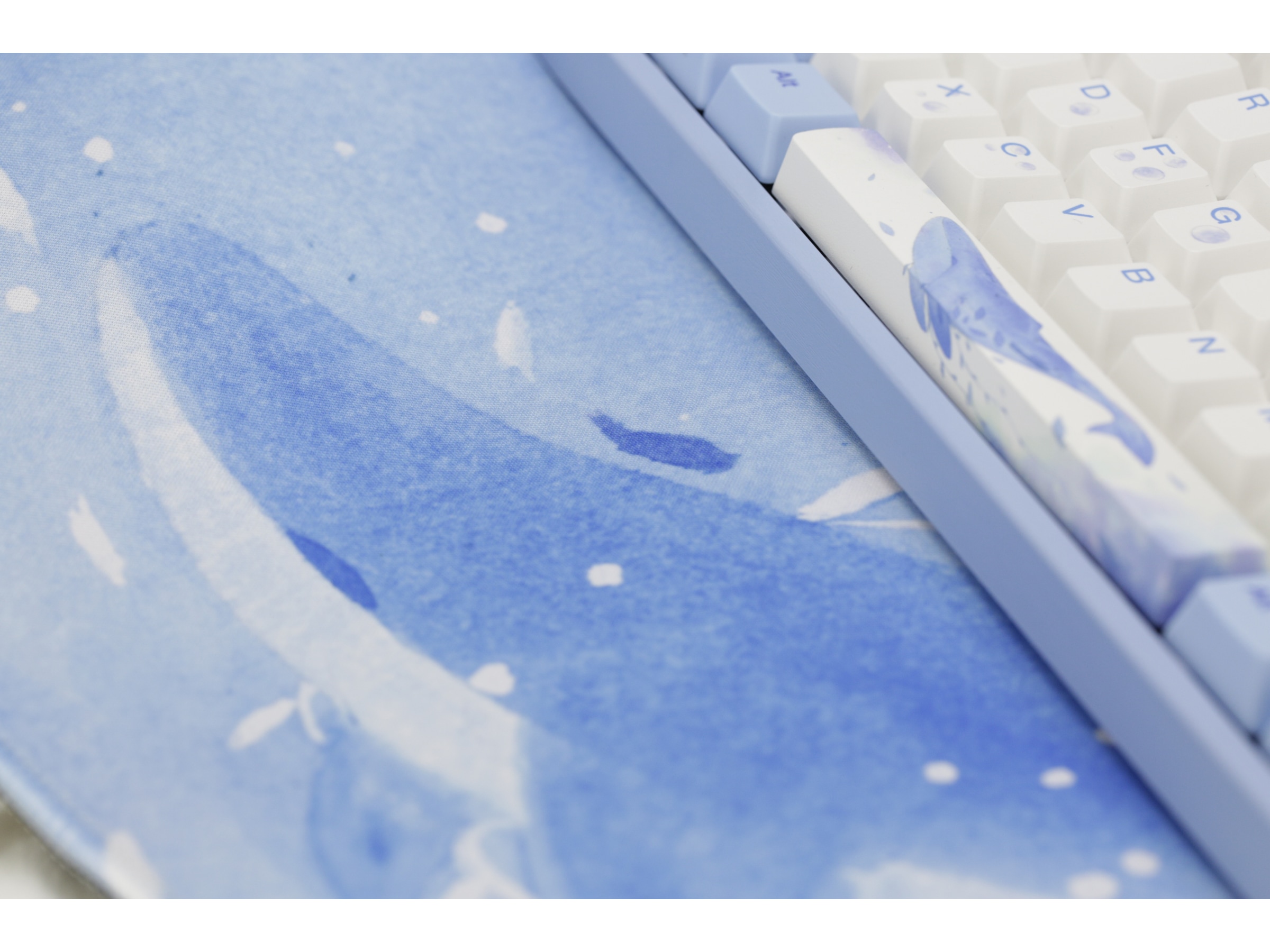 Varmilos ekstra store skrivebordsmatte Sea Melody er en skrivebordsmatte av høy kvalitet med blåhvalfalldesign. den utfyller Sea Melody-tastaturet deres perfekt og ser også flott ut til alle slags bordoppsett.