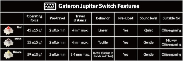 Vår eksklusive Gateron Jupiter mekaniske bryter (kun for den ferdigmonterte versjonen) kommer med en 3-pinners design, den er forhåndssmurt med en pålitelig Gateron kvalitetsstandard med opptil 80 millioner tastetrykk levetid. Mens deres unike LED-diffusordesign tilbyr høy RGB-bakgrunnslystransmittans og mykere bakgrunnslyseffekt.