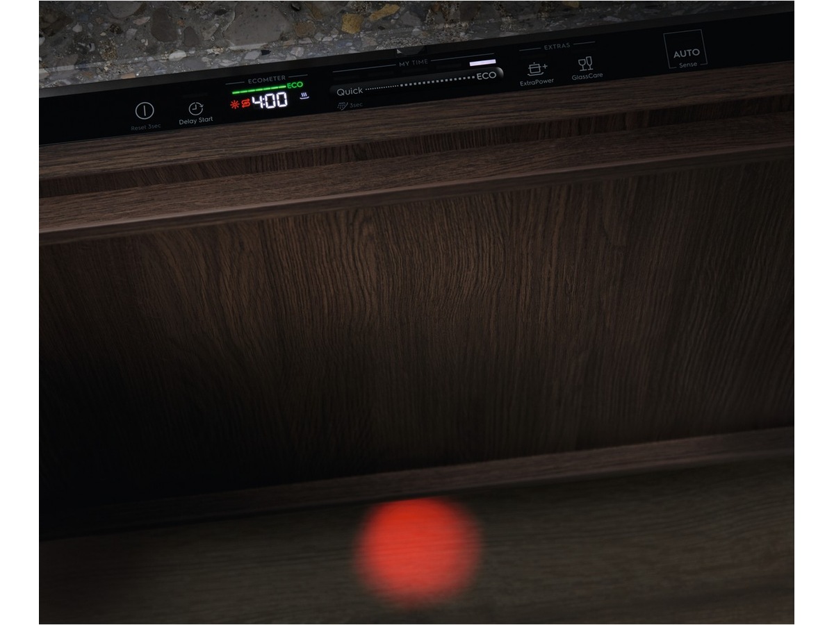Lyset fra Beam on Floor-systemet holder kjøkkenet stille. I stedet for et høyt pip som kan drukne i bakgrunnsstøy, viser oppvaskmaskinen deg sin status ved å projisere en lysprikk på gulvet. Rødt lys når den er i gang og grønt når den er ferdig.