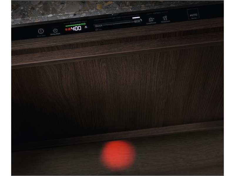 Lyset fra Beam on Floor-systemet holder kjøkkenet stille. I stedet for et høyt pip som kan drukne i bakgrunnsstøy, viser oppvaskmaskinen deg sin status ved å projisere en lysprikk på gulvet. Rødt lys når den er i gang og grønt når den er ferdig.