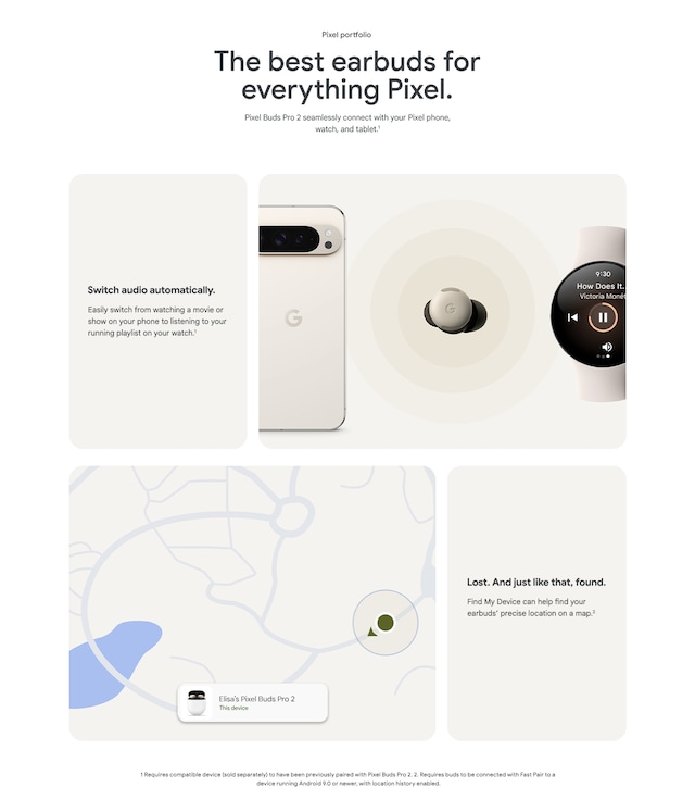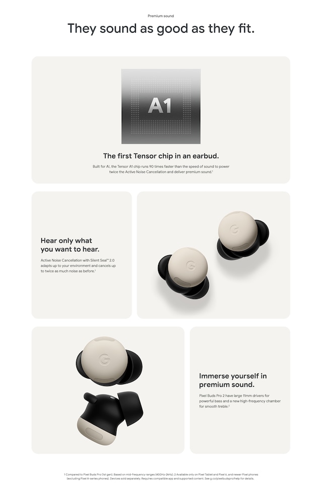 | Detaljer | Vindblokkerende nettingdeksler, Tensor A1-prosessor, Aktiv trykkavlastning i øret, Dekselspeaker for Finn enheten min |
