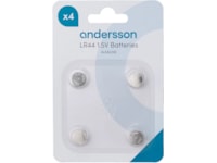 Andersson LR44 er et lite knappcellebatteri med lang levetid som brukes i fjernkontroller, klokker, termometre, kalkulatorer, Game & Watch-spill og mer. Denne pakken inneholder fire LR44 1,5 volts alkaliske knappcellebatterier.