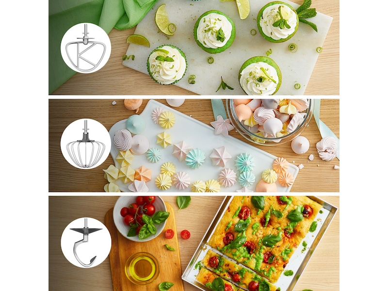 En 4 liters miksebolle, 3 høydejusterbare og målrettede verktøy og en slitesterk motor på 800 W gjør det mulig for Go å lage en to-nivås kake, pizza for hele familien eller et brød uten å svette.
