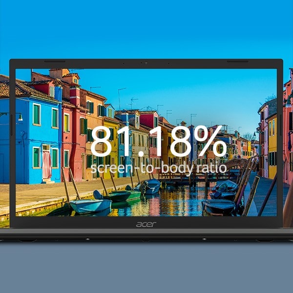 Skap på FHD. Den har 81,18 % skjerm-til-ramme-forhold, Acer Color Intelligence™ samt Acer BlueLightShield™ for dynamisk fargeoptimalisering og seerkomfort.