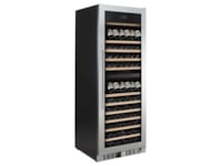 Vinskapet har et stilig utseende med rustfri stålfront. Det innvendige LED-lyset kan veksles melllom blått eller rødt lys. De solide, uttrekkbare trehyllene i bøk gir et eksklusivt utseende.