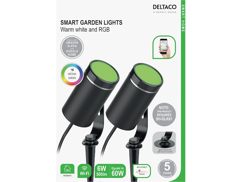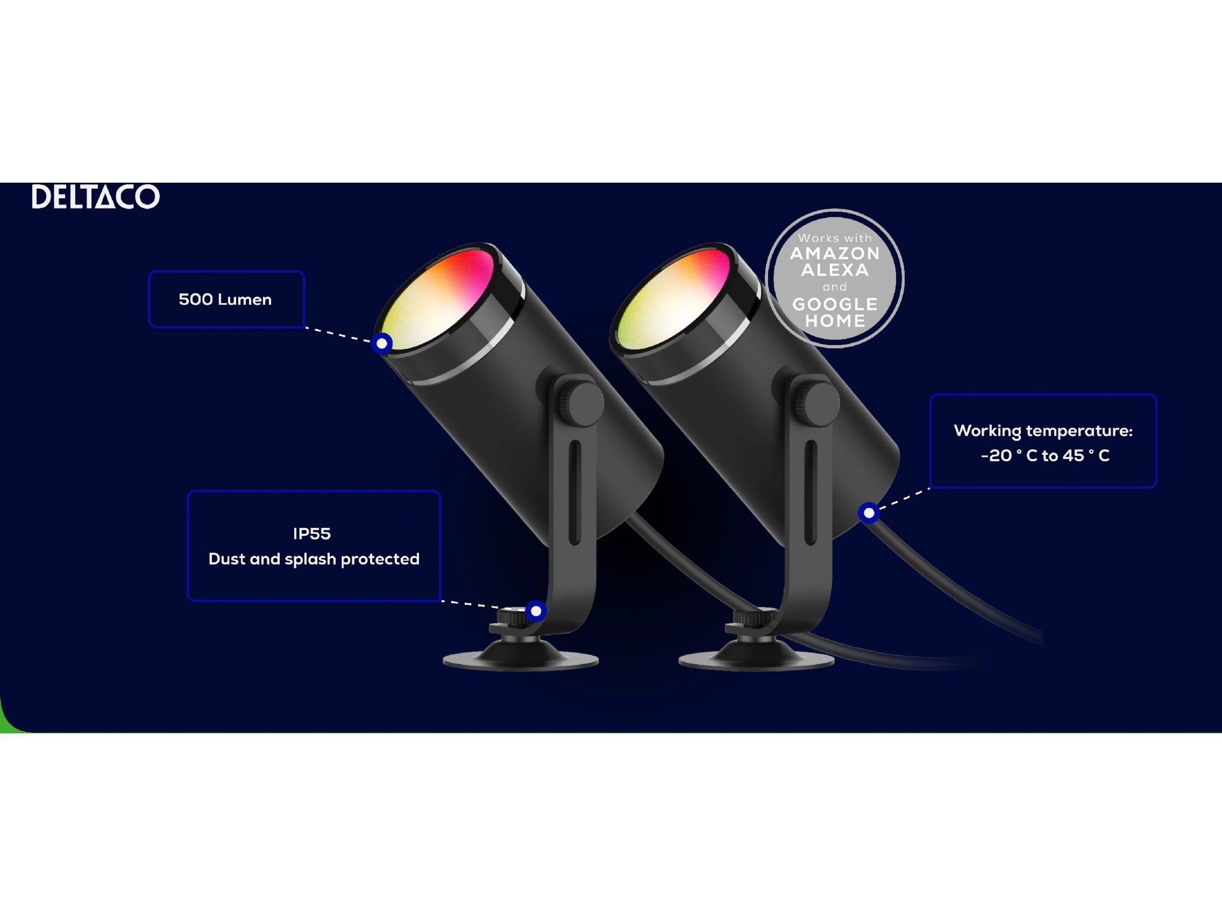 DELTACO SMART HOME Garden light 2 lights, 6W per light, RGB + 2700K Working temperature: -20 ° C to 45 ° C Network protocol: IEEE 802.11 b / g / n Power (one light bulb): Max 6W Lumen (a light bulb): 500lm