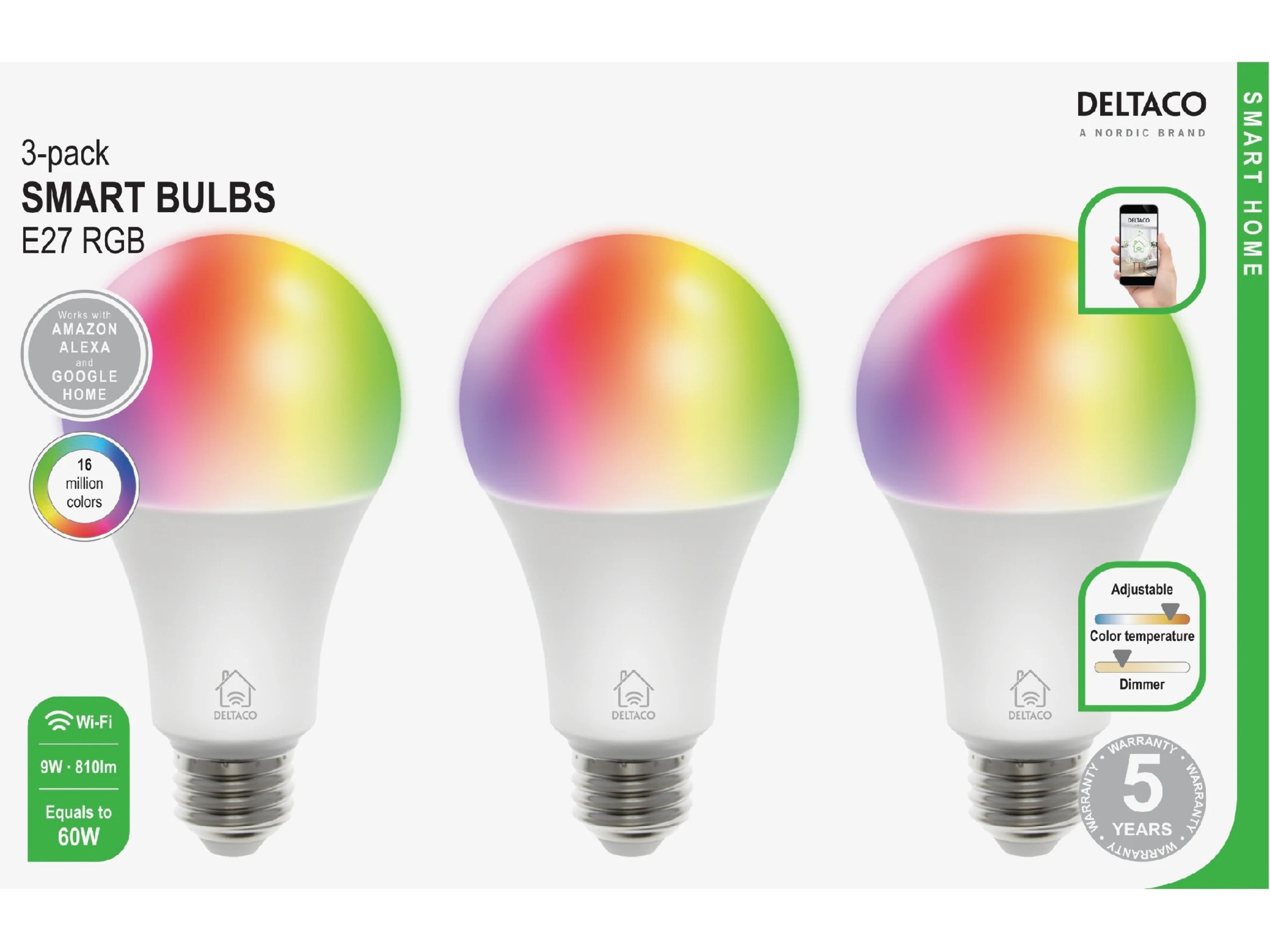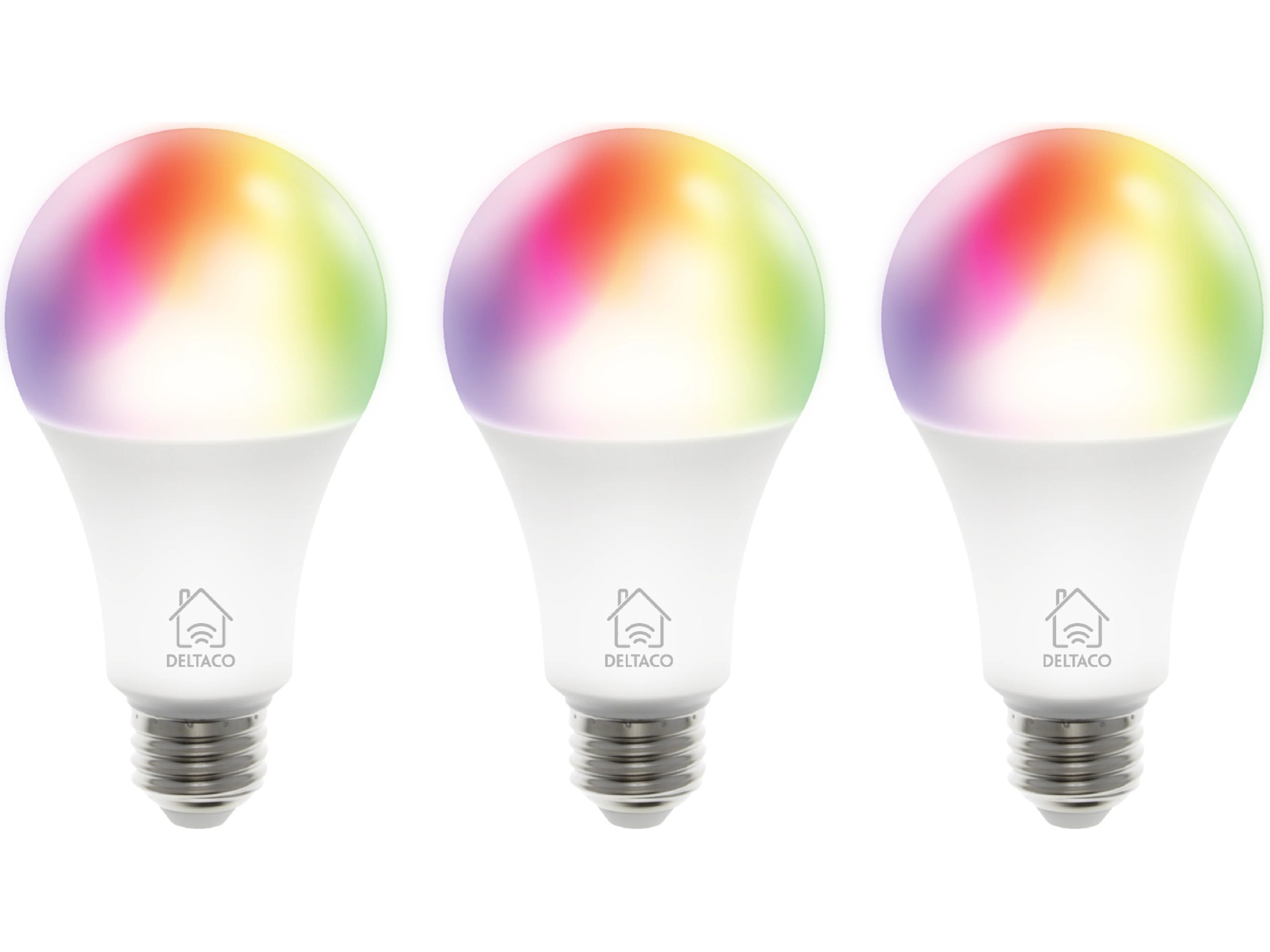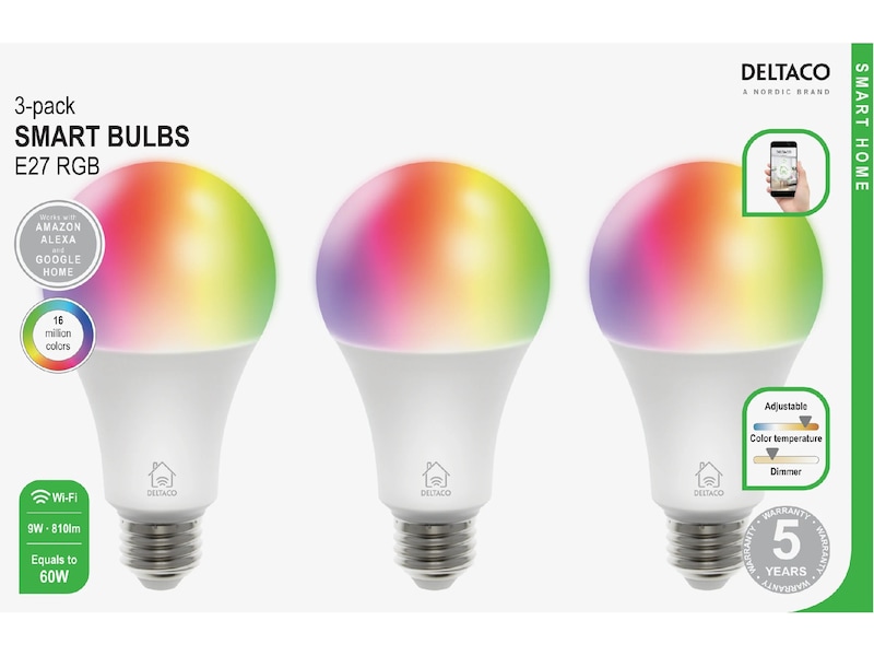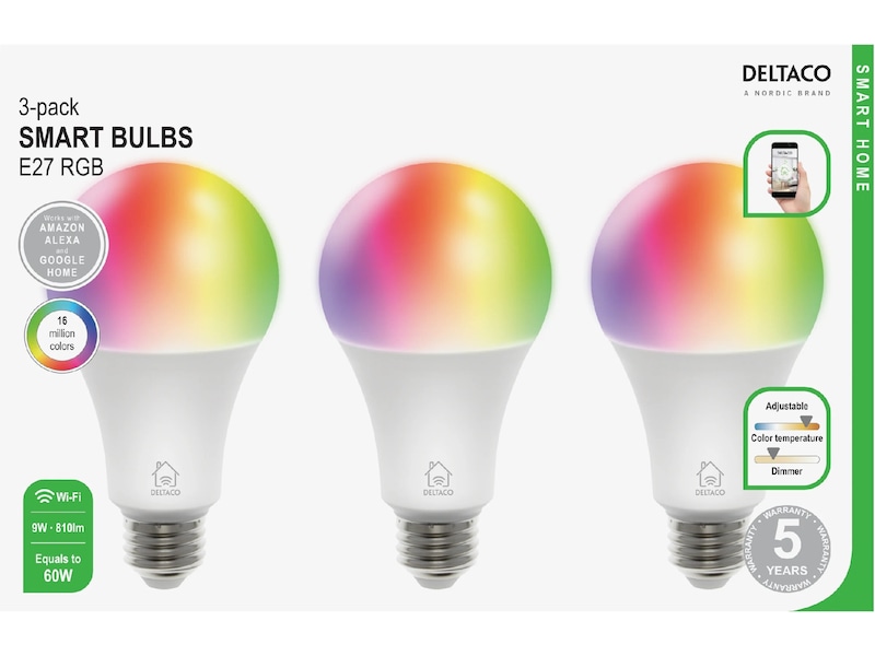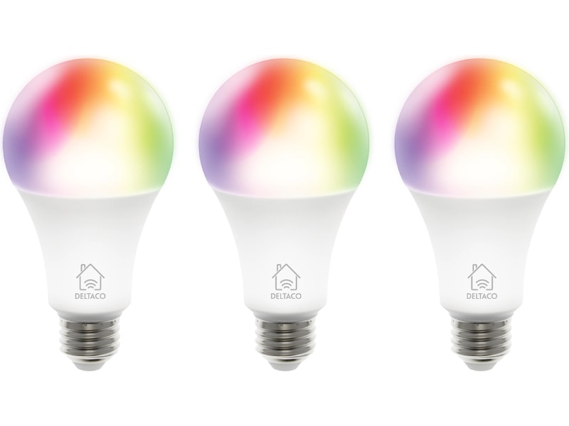 SMART HOME RGB LED-lampe 3-pakning, E27, WiFI 2,4GHz, 9W, 810lm, dimbar, 16m farger, 220-240V, hvit