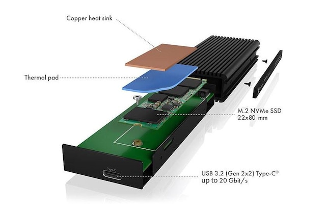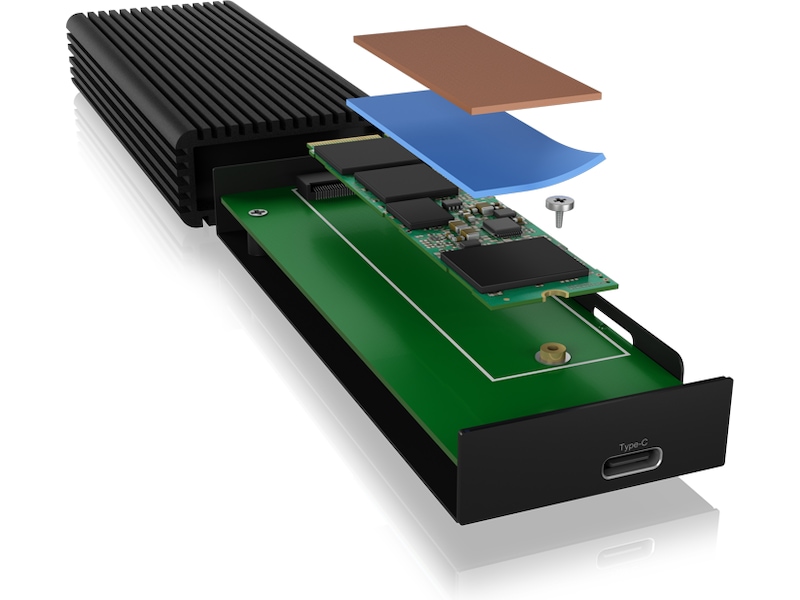 - COOLING: The heat inside the heat sink is ideally conducted to the outside of the enclosure via the heat sink and the silicone heat pad. This keeps the NVMe SSD cool even under full load