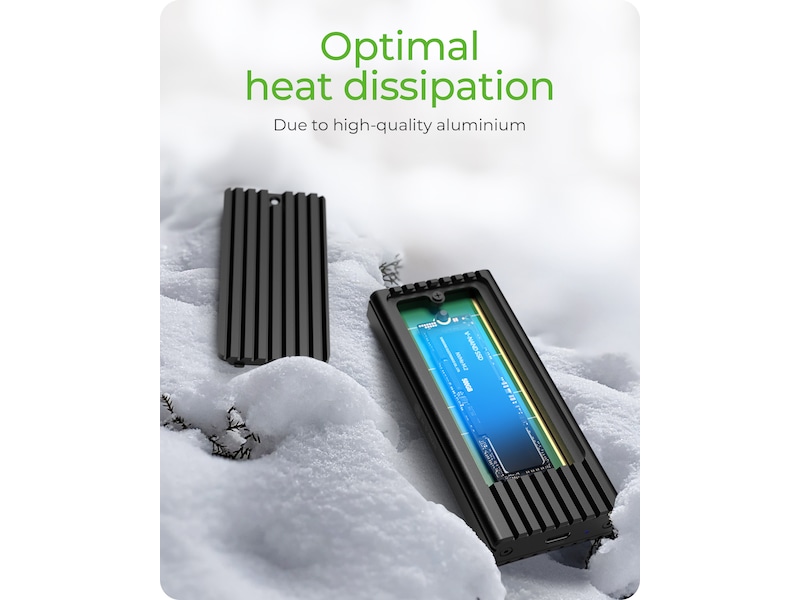 - Optimal heat dissipation: The aluminium housing has been developed with cooling fins and, thanks to a particularly large surface area, simultaneously offers a compact design and efficient heat dissipation of the M.2 SSD