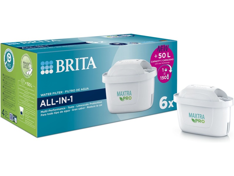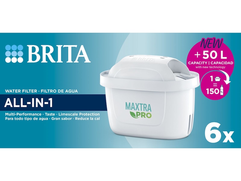 Brita Maxtra Pro All-In-1 -vattenfilter minskar kalkavlagringar, smakstörande ämnen så som klor, bly och koppar samt spår av vissa bekämpningsmedel och läkemedel.