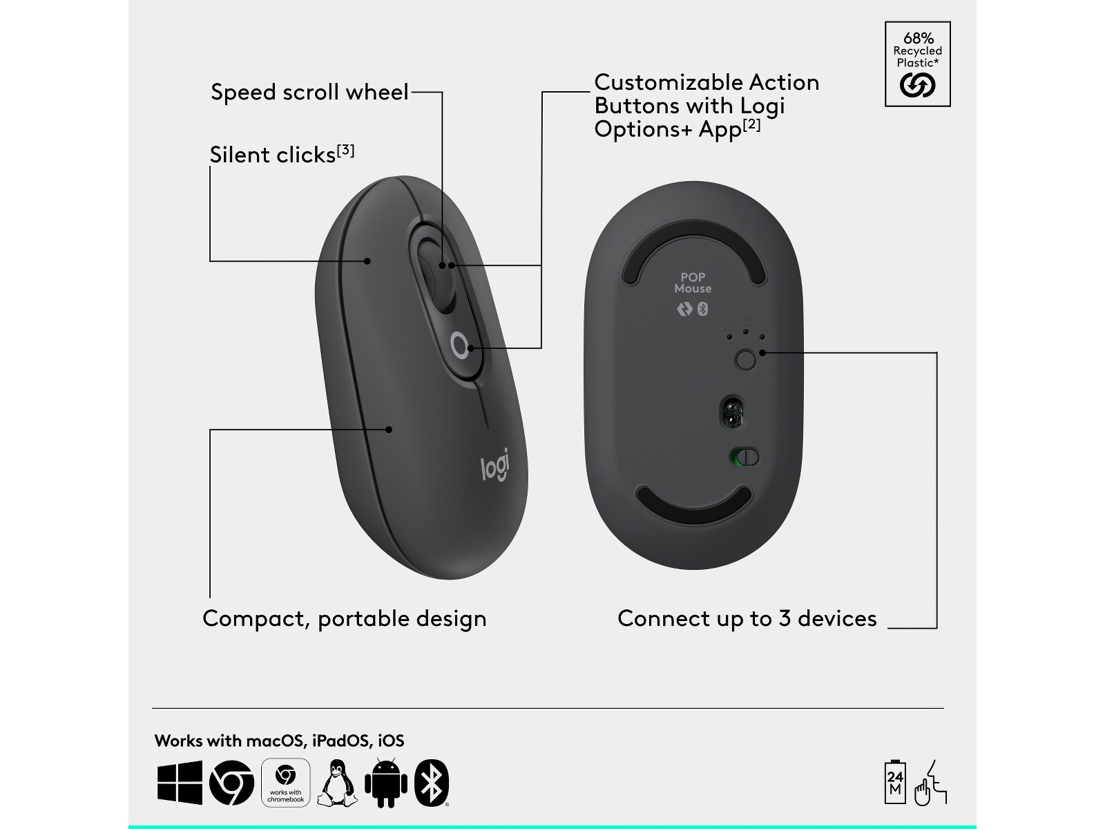 SmartWheel, SilentTouch-teknologi, Automatisk dvalemodus, Programmerbar toppknapp, High Precision Optical Tracking, 3 enheter med samtidig konnektivitet, Logitech Flow, Easy-Switch-teknologi
