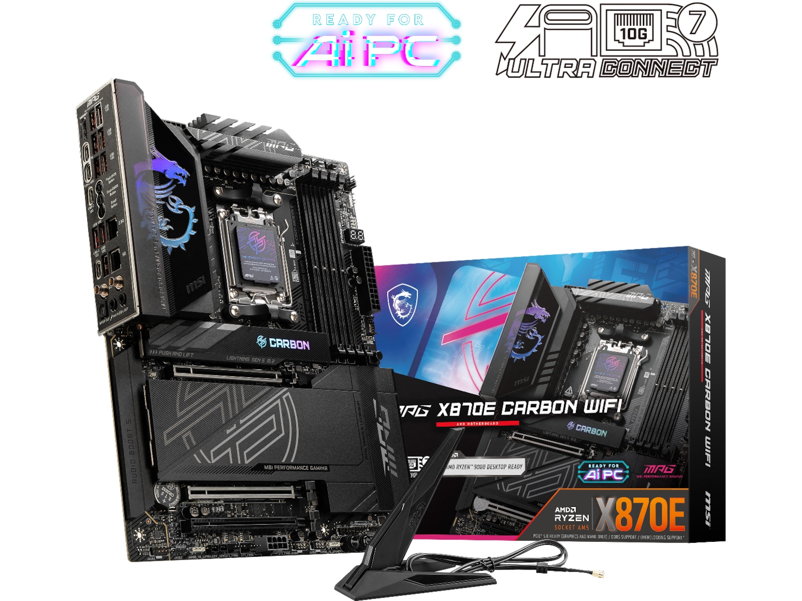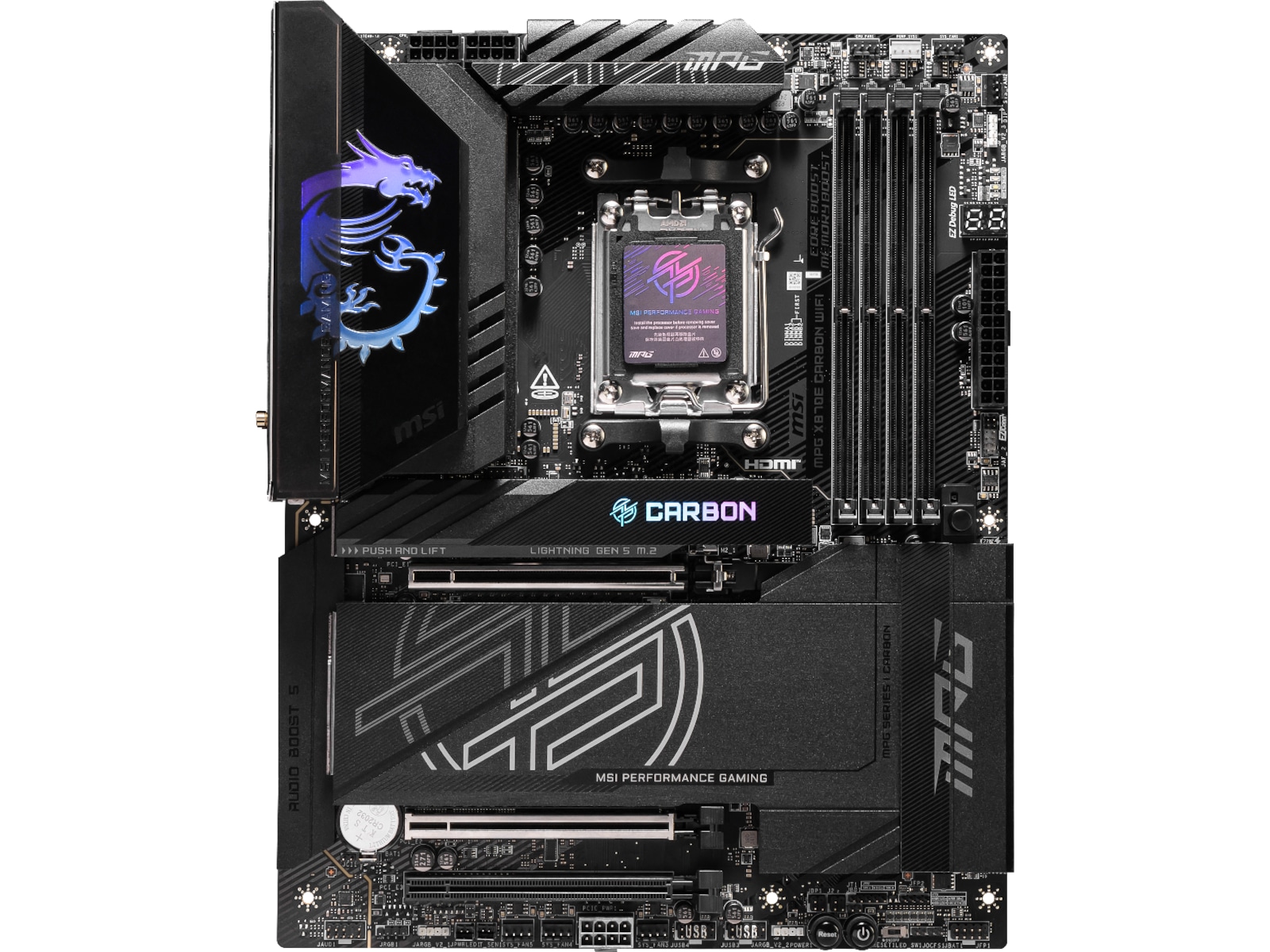 MPG X870E CARBON WIFI anvender et karbon-svart fargeskjema og stilfullt mønster over Mystic Light RGB-belysning for å vise en annen identitet. Den er også kraftig innvendig ved å ha 5G LAN, ekte Wi-Fi 7-løsning, USB 40Gbps, tilleggs-PCIe-strøm, og de nyeste EZ DIY-designene, noe som gjør dette hovedkortet til et av de beste X870E ATX-hovedkortene for Ryzen 9000-serie prosessorer.