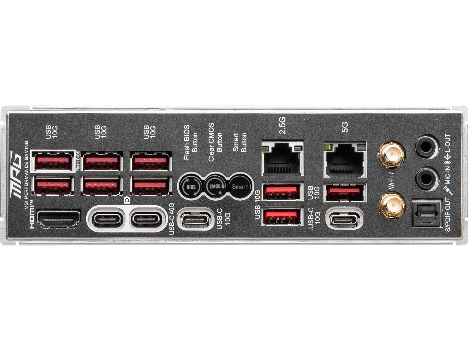 Grensesnitt 2 x USB4, 1 x lydutlinje - minijakk, 1 x HDMI, 1 x mikrofon - minijakk, 1 x SPDIF-utgang, 2 x antenne, 9 x USB 3.2 Gen 2, 1 x LAN (5Gigabit Ethernet), 2 x USB-C 3.2 Gen 2, 1 x LAN (2.5Gigabit Ethernet)