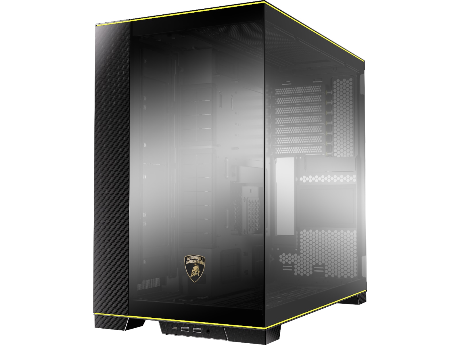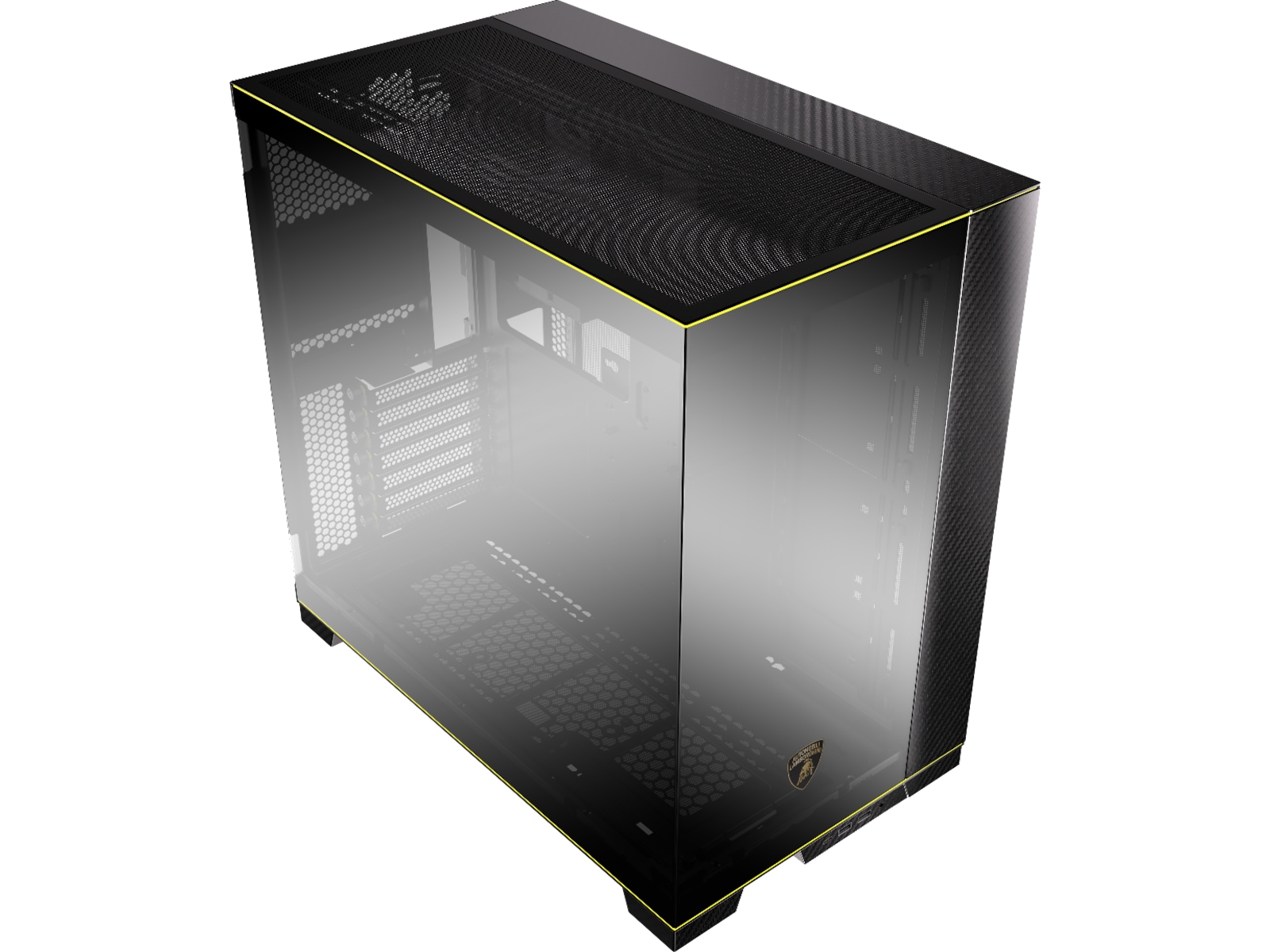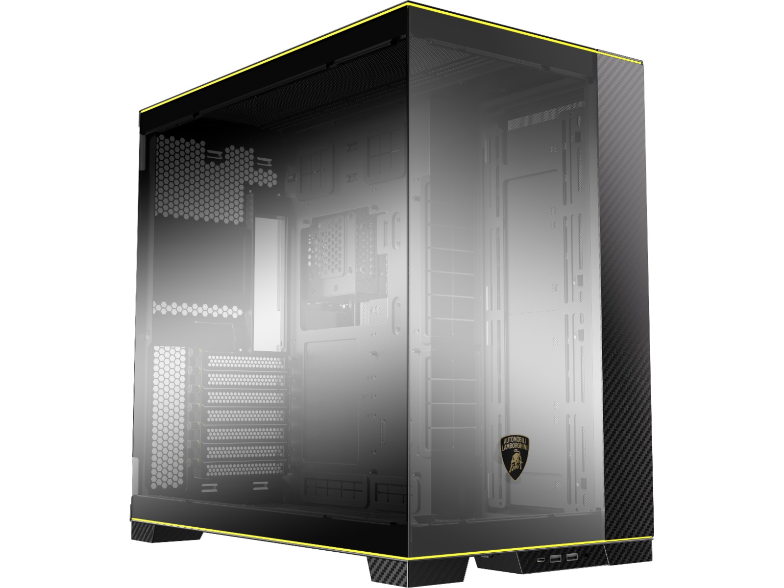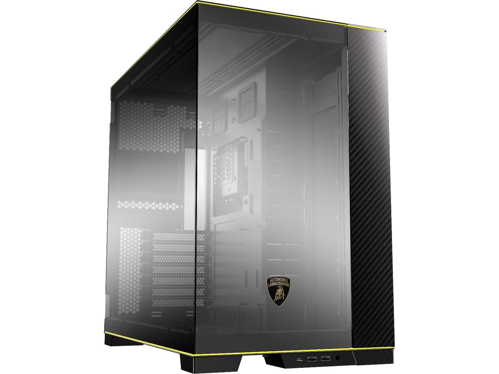 Ånden til Automobili Lamborghini er nedfelt i LIAN LI O11D, understreket av den ikoniske Automobili Lamborghini-logoen trykt på glasspanelet i forkrommet speilfinish. Dette samarbeidet mellom de to merkene er gjenkjennelig umiddelbart