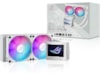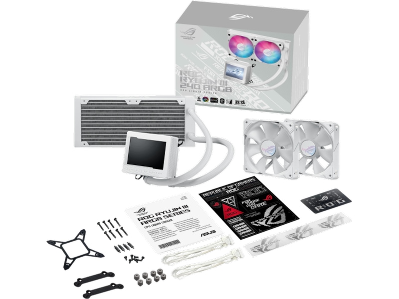 Go cooler than cool with the Ryujin III White Edition. Its pristine frame houses an expansive 3.5-inch LCD screen that displays live system stats, animated GIFs, or even your own custom artwork. Underneath, a new 8th Gen Asetek pump quietly keeps the latest processors from Intel and AMD cool, while an embedded Axial-tech fan helps control motherboard VRM temps. And the coolant within flows through 400mm of reinforced tubing and a higher capacity radiator chilled by two magnetic ROG 120 mm ARGB fans, making installation and customization a snap