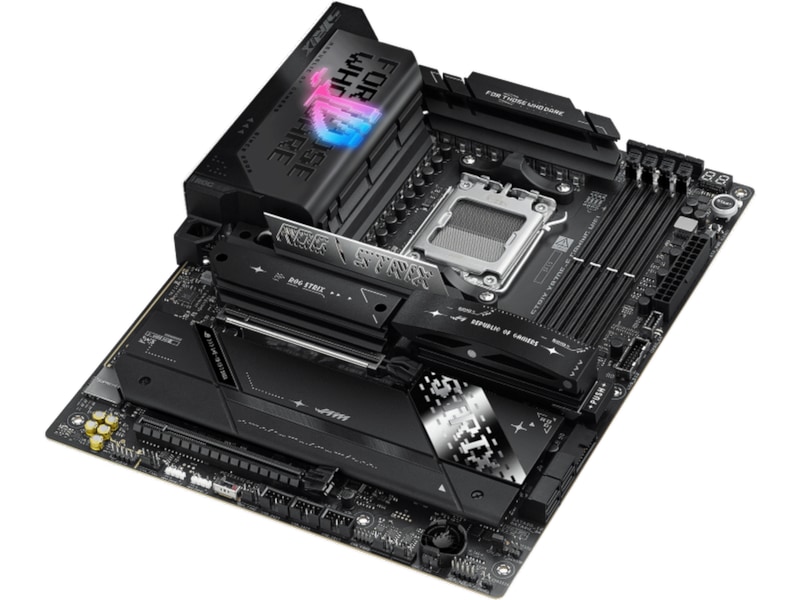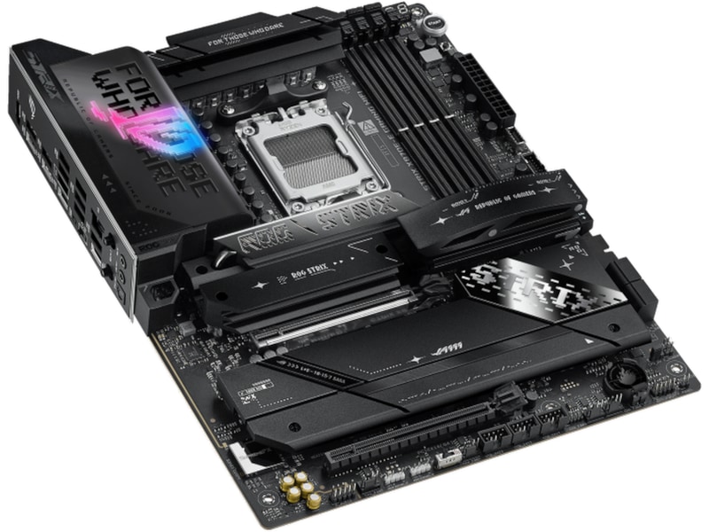 Strix X870E-E omfavner den nye standarden fullt ut og tilbyr ende-til-ende PCIe 5.0-støtte. Det øverste x16-utvidelsessporet er Gen 5-ready, og er beskyttet med en SafeSlot-holderebrakt for å tåle vekten av de nyeste skjermkortene. Tre av de innebygde M.2-sporene er utstyrt for lese- og skrivehastigheter på 16 GB/s takket være PCIe 5.0-grensesnittet, mens alle resten kan levere fortsatt imponerende 8 GB/s overføringer. Hvert M.2-spor er dekket med betydelige kjøleribber for å sende varmen fra neste generasjons harddisker.