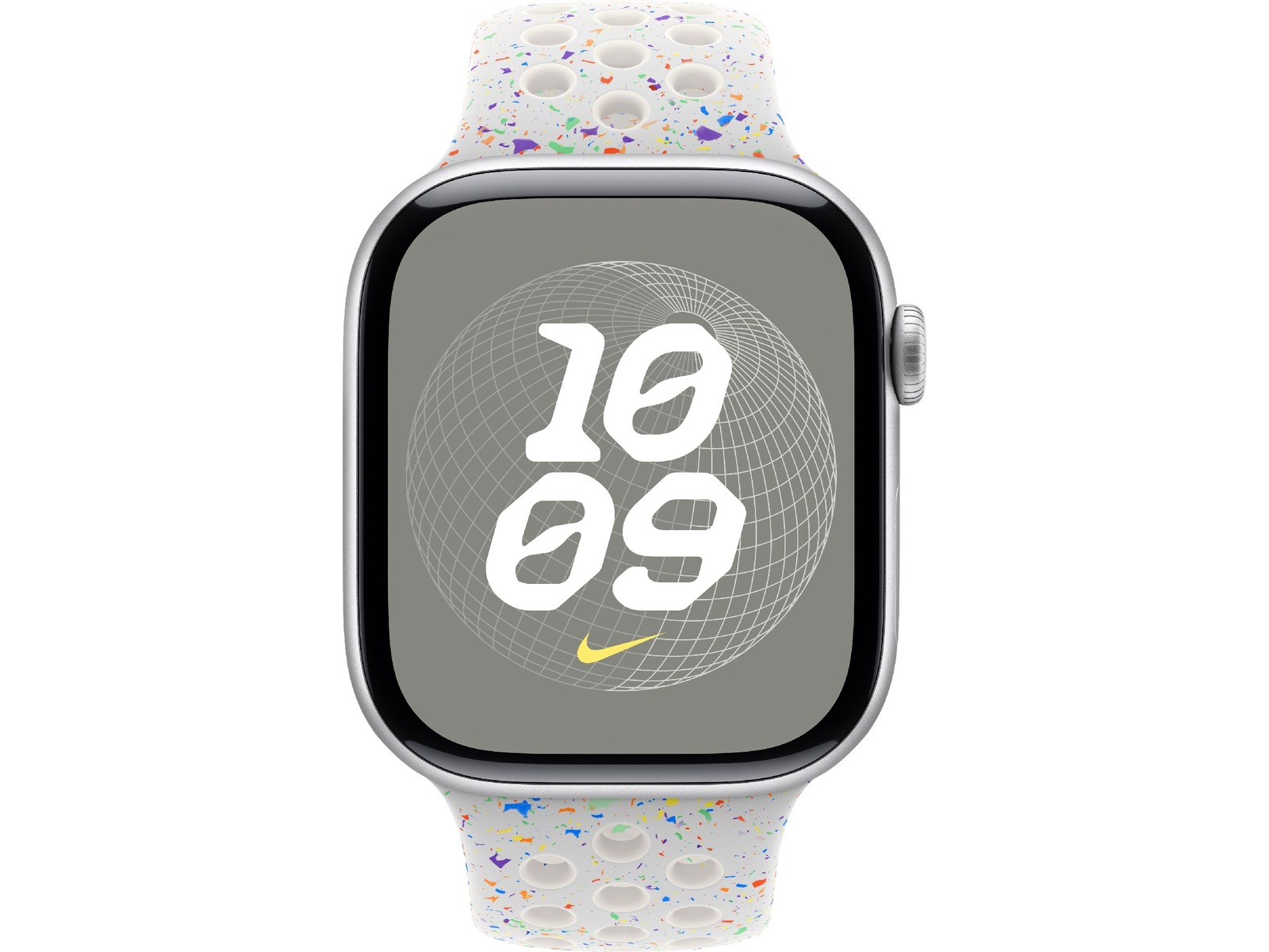 Nike Sport Band er laget med presstøpte perforeringer som gir huden luft. Remmen er slitesterk, men likevel overraskende myk. Den har fargerike flak som skaper et tilfeldig mønster, noe som gjør hver rem helt unik. Det jevne, solide materialet former seg elegant rundt håndleddet og føles behagelig mot huden. En låsepinne av aluminium har en stilren, matt finish.