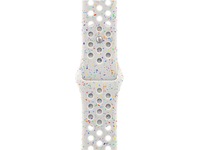 Nike Sport Band er laget med presstøpte perforeringer som gir huden luft. Remmen er slitesterk, men likevel overraskende myk. Den har fargerike flak som skaper et tilfeldig mønster, noe som gjør hver rem helt unik. Det jevne, solide materialet former seg elegant rundt håndleddet og føles behagelig mot huden. En låsepinne av aluminium har en stilren, matt finish.