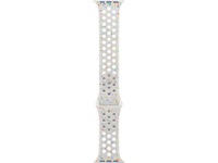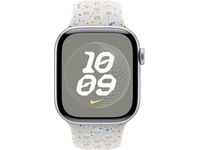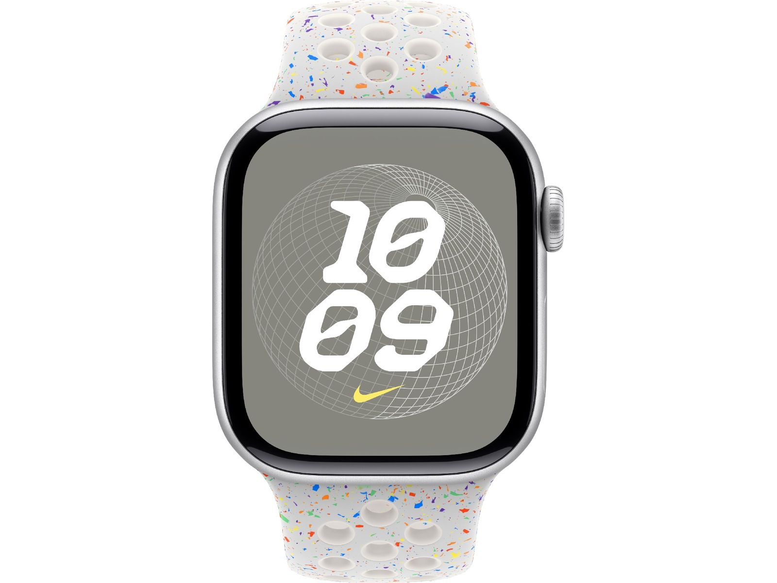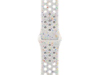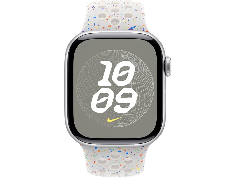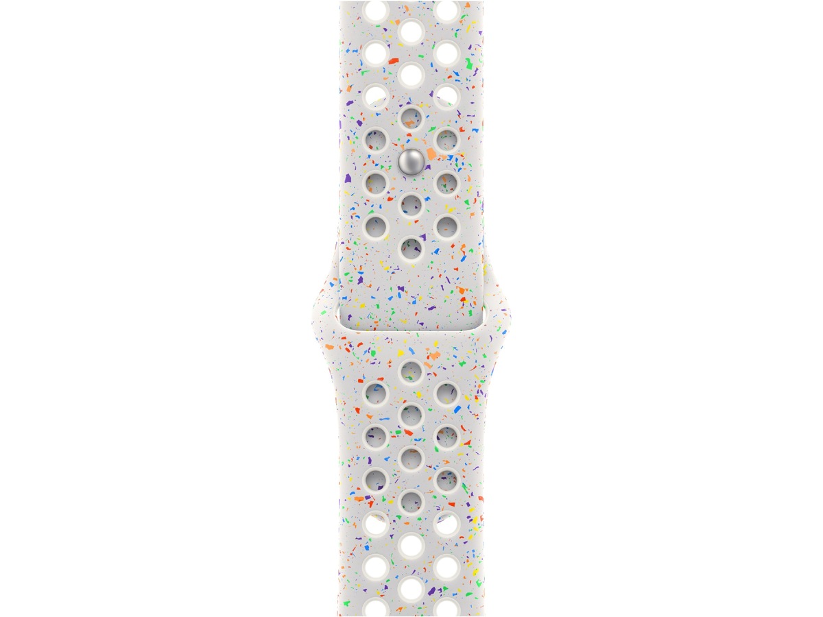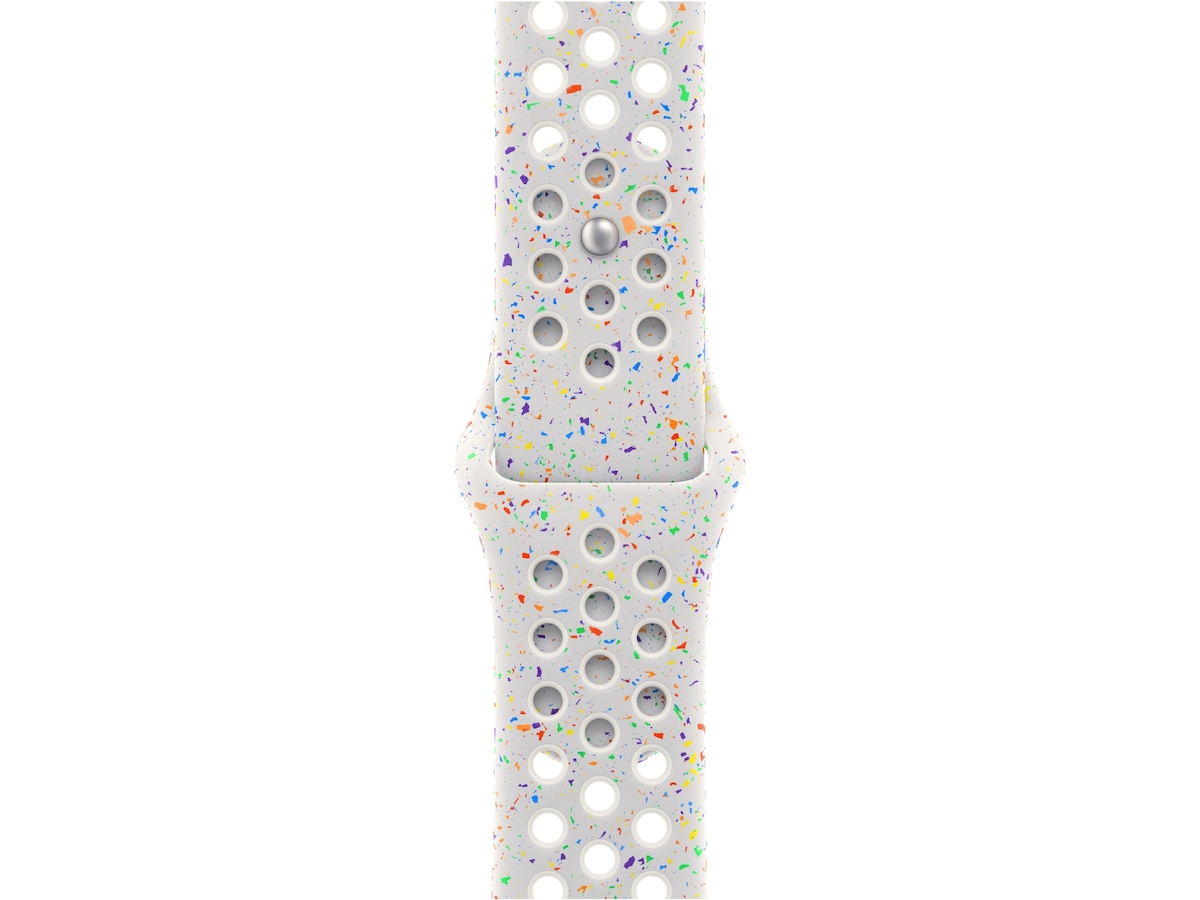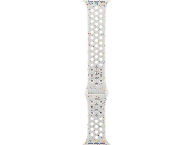 Nike Sport Band er laget med presstøpte perforeringer som gir huden luft. Remmen er slitesterk, men likevel overraskende myk. Den har fargerike flak som skaper et tilfeldig mønster, noe som gjør hver rem helt unik. Det jevne, solide materialet former seg elegant rundt håndleddet og føles behagelig mot huden. En låsepinne av aluminium har en stilren, matt finish.