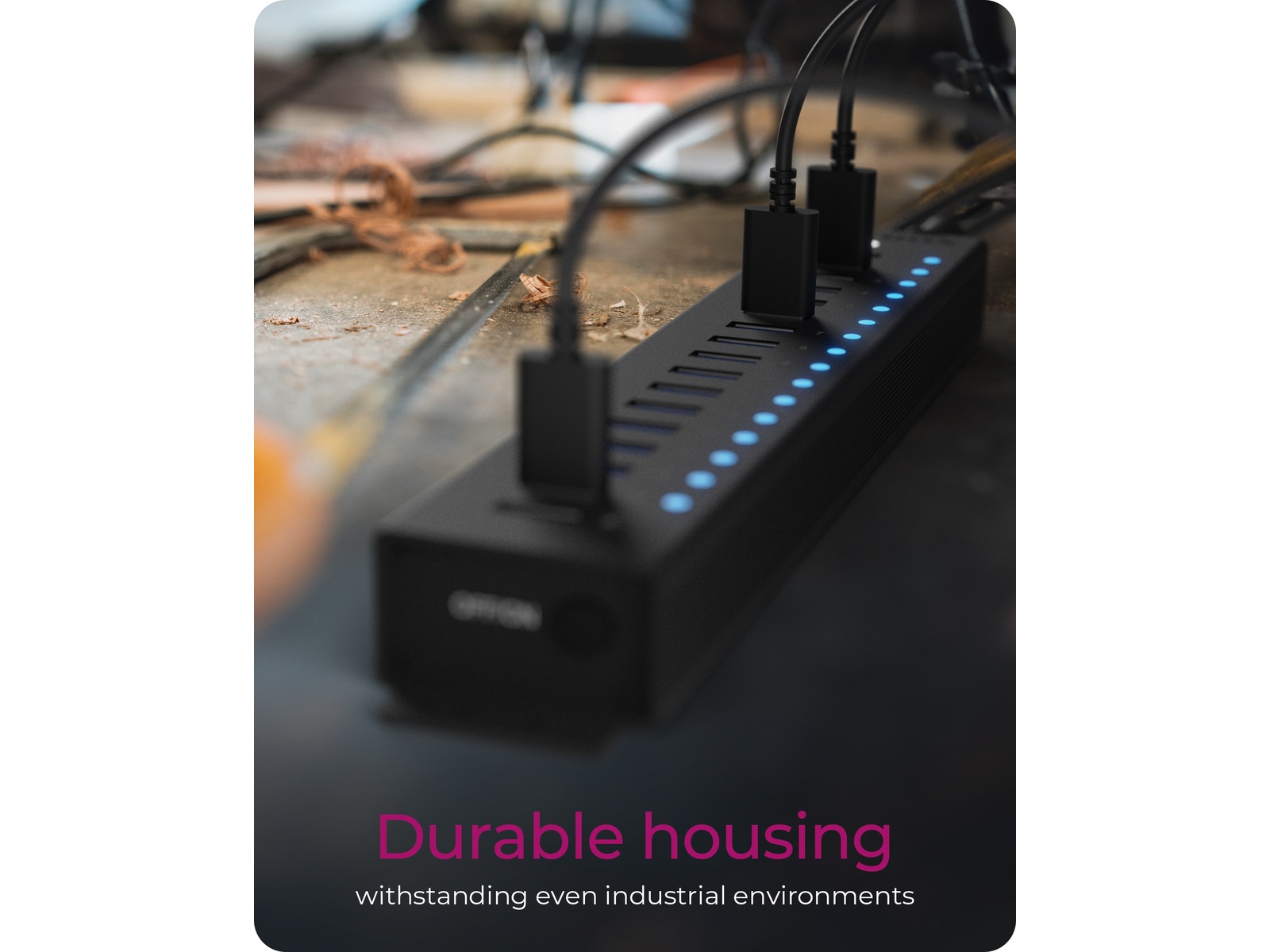 The USB hub’s housing is made of solid aluminium, offering outstanding durability and impact resistance compared to competing products made of plastic. For a secure hold, additional mounting brackets are included for desk attachment. This ensures long-term and reliable use.
