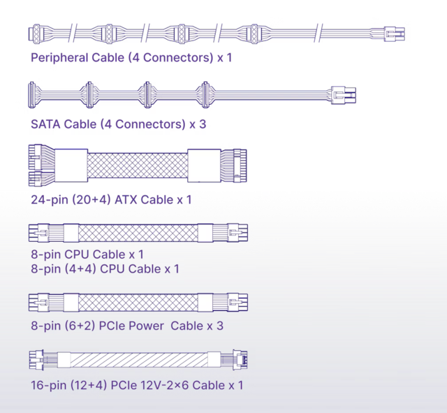 Medfølgende kabler AC-inngangskabel - ekstern, Strøm 24-stifts ATX med avtakbar 4-stifts modulær kabel 60 cm, 16-stifts 12VHPWR strømkabel 65 cm, Modulkabel for 8-pins EPS12V strøm 70 cm, 2x seriell ATA-modulkabel 65 cm, Strøm 8-stifts +12 V med avtakbar 4-stifts seksjon modulær kabel 70 cm, 4-pins intern strømkabel 65 cm, 8-pins PCI Express-strøm med avtakbar 2-pins delmodulkabel 65 cm