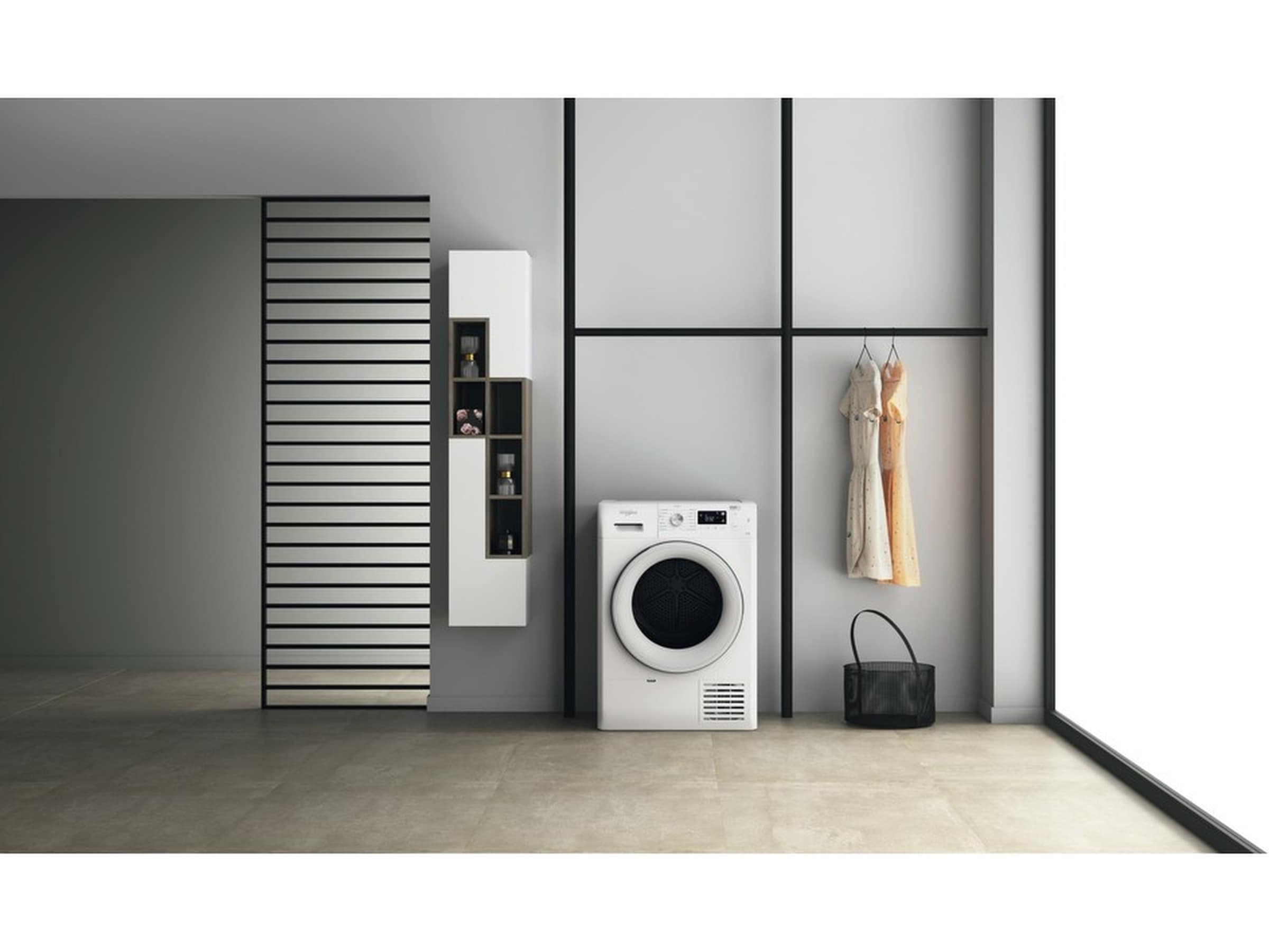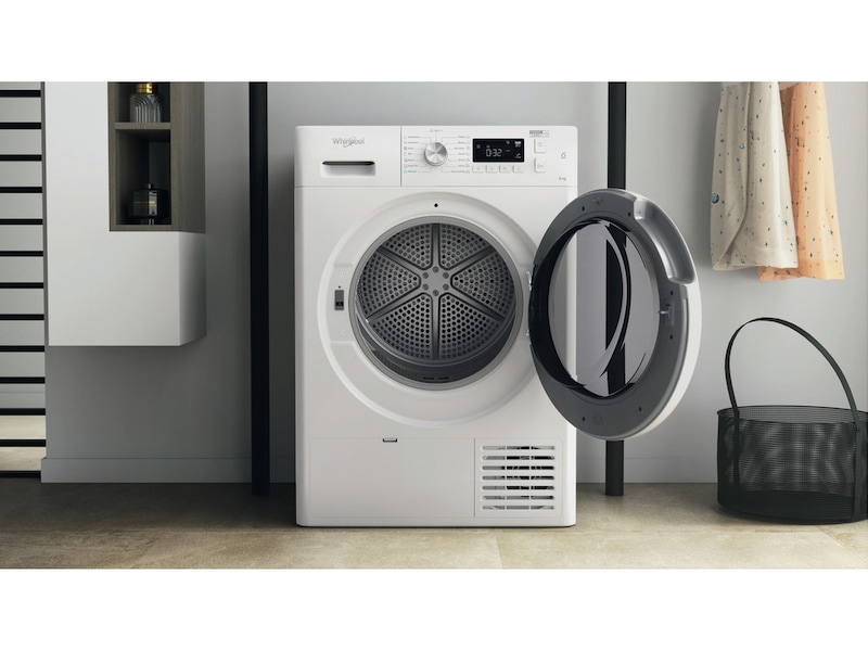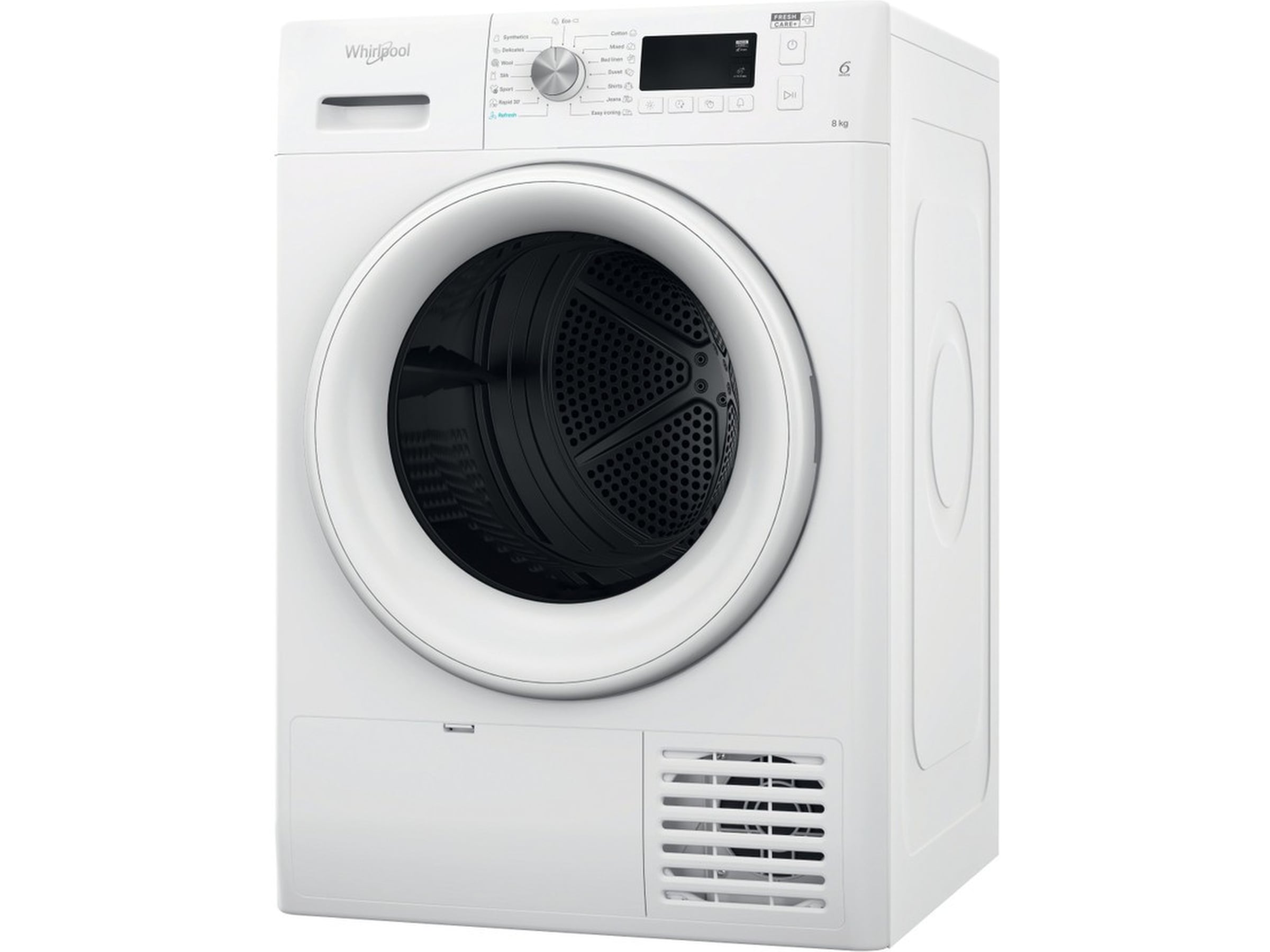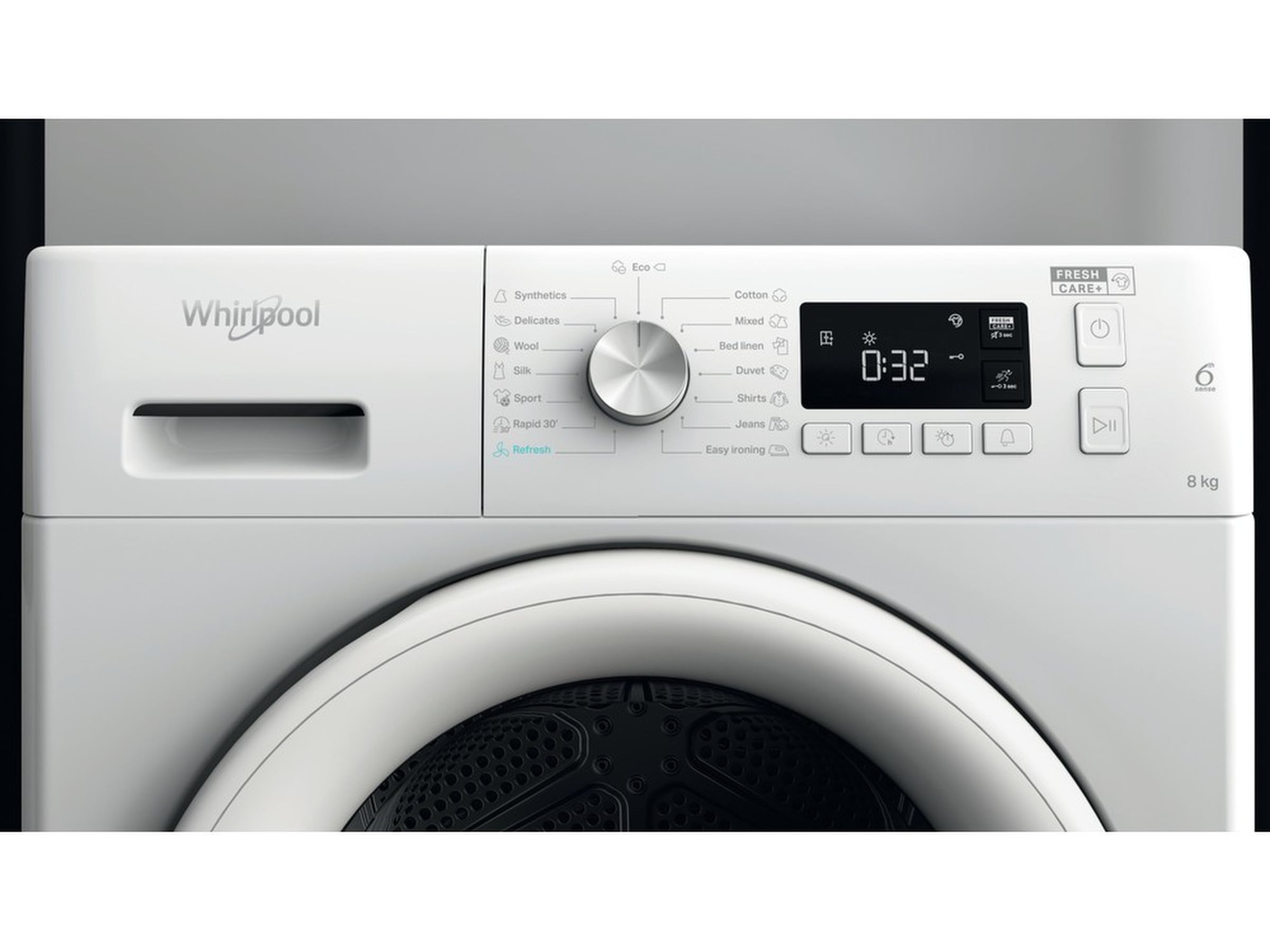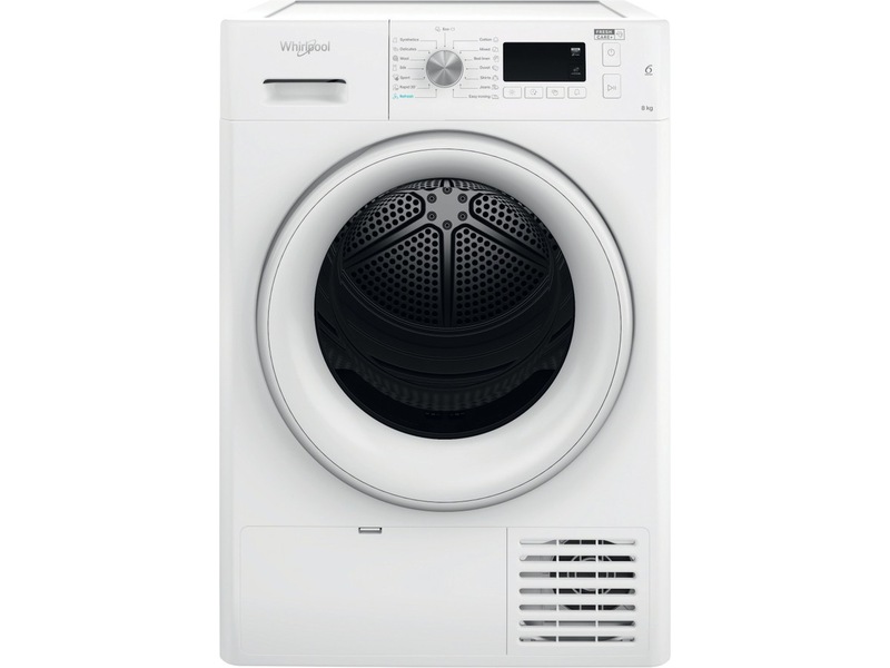 Denne frittstående tørketrommelen fra Whirlpool har følgende funksjoner: romslig 8,0kg trommelkapasitet. Eksklusiv 6TH SENSE-teknologi som overvåker fuktigheten i trommelen konstant, beskytter klærne dine og gir et ideelt tørkeresultat. Heat Pump-teknologi varmer effektivt opp igjen luften i maskinen, noe som reduserer energiforbruket betydelig.