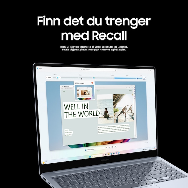 Recall vil ikke være tilgjengelig på Galaxy Book4 Edge ved lansering. Recalls tilgjengelighet er avhengig av Microsofts utgivelsesplan.