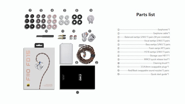 | Medfølgende tilbehør | MMCX-hjelpeverktøy, 4.4 mm plug, Earphone cable, 2 par dyseinnlegg, 2 par skumøretupper, 3 par bassørepropper, Lagereske, Rensebørste, 3 par vokale ørepropper, 3.5 mm plug, 3 par balanserte ørepropper |