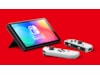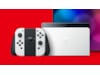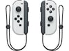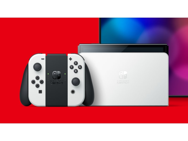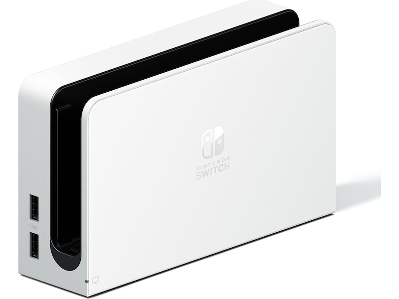 Nintendo Switch med 7" OLED-Skjerm, 64GB internlagring og forbedrede høyttalere. Hvite Joy-Con-kontrollere, svart konsoll og hvit dokkingstasjon.